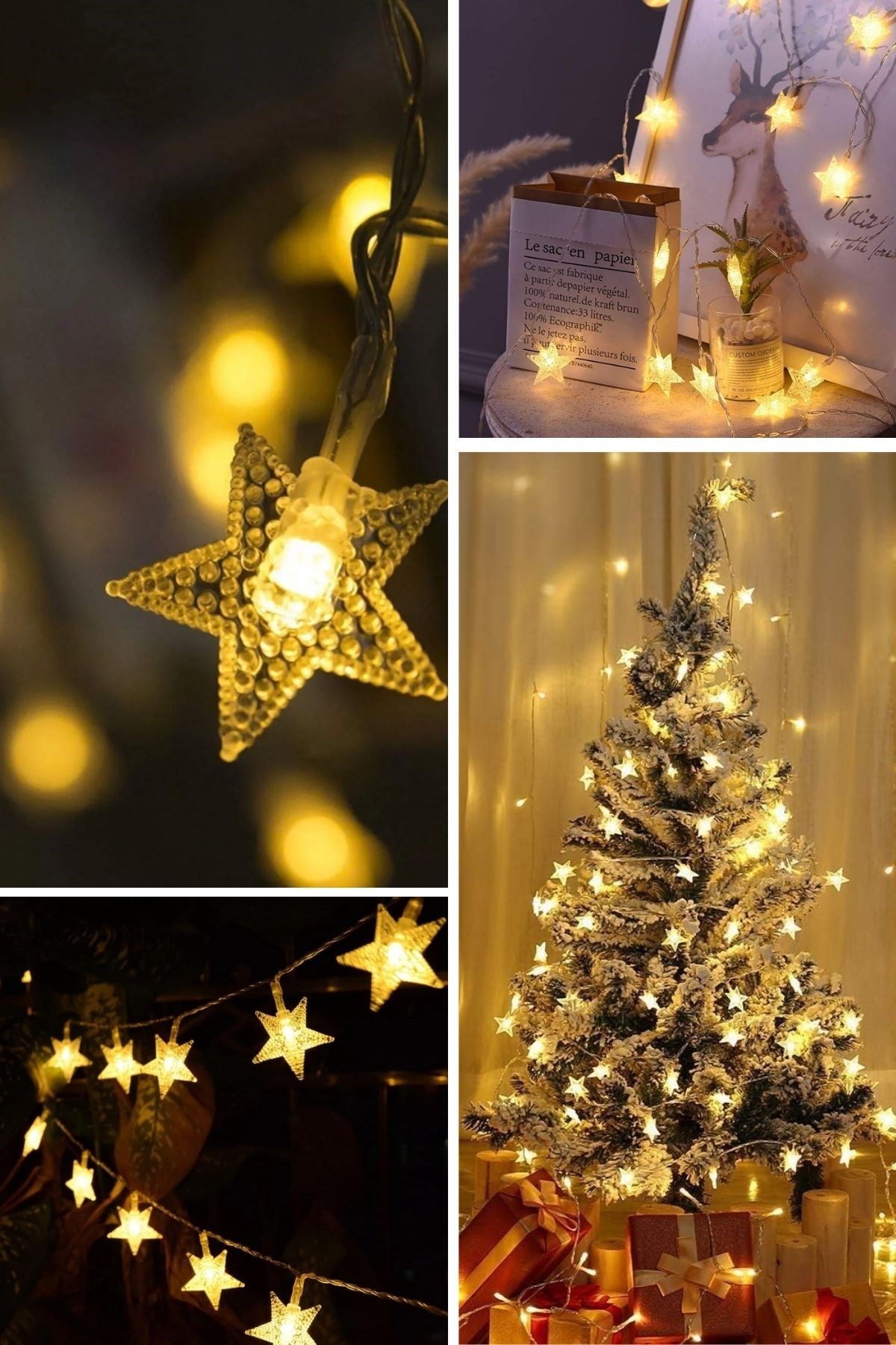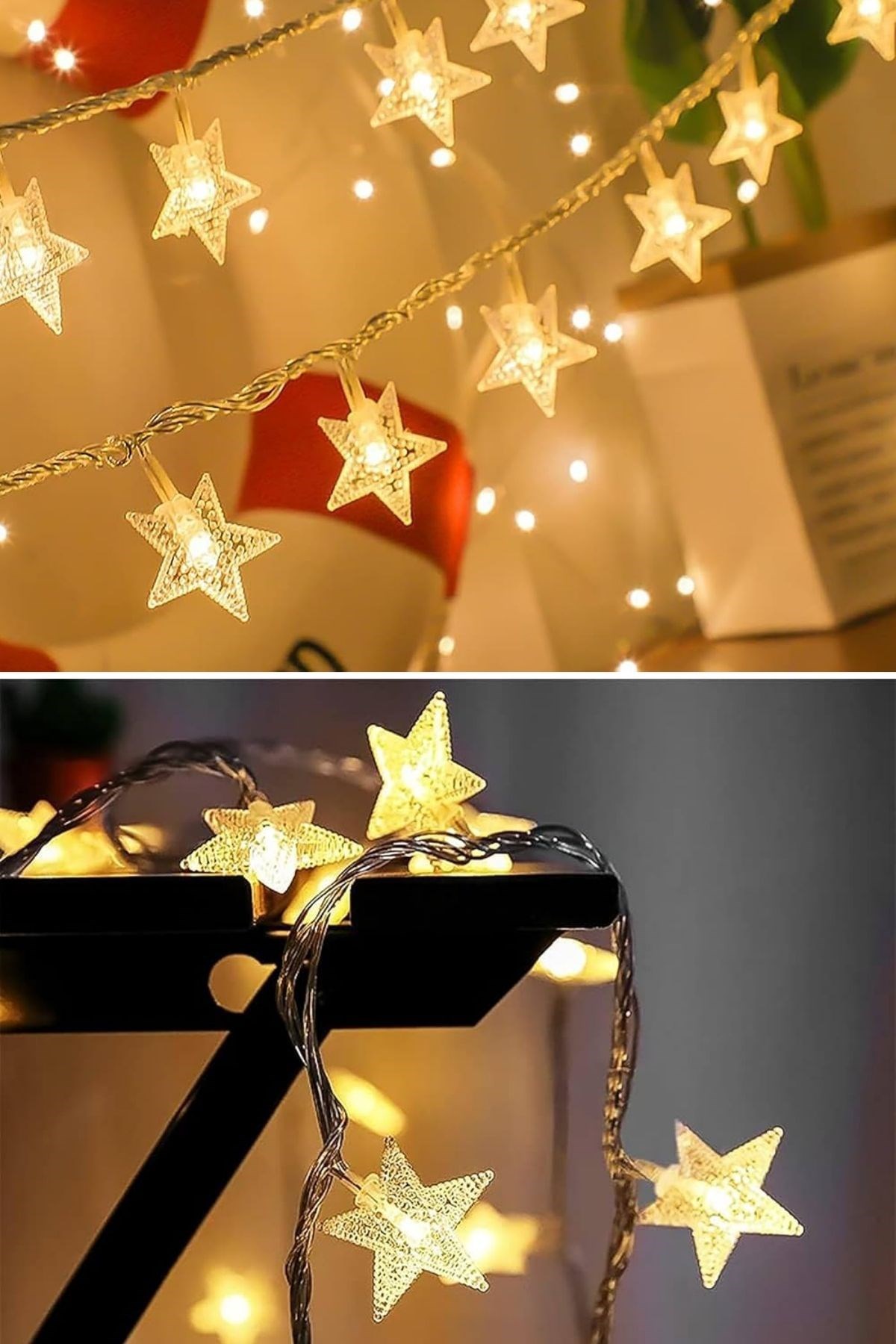 Dekoratif Aydınlatma: Yıldız şekilli 20 LED ampul, 5 metre uzunluğunda kablo üzerinde eşit aralıklarla dizilmiştir.