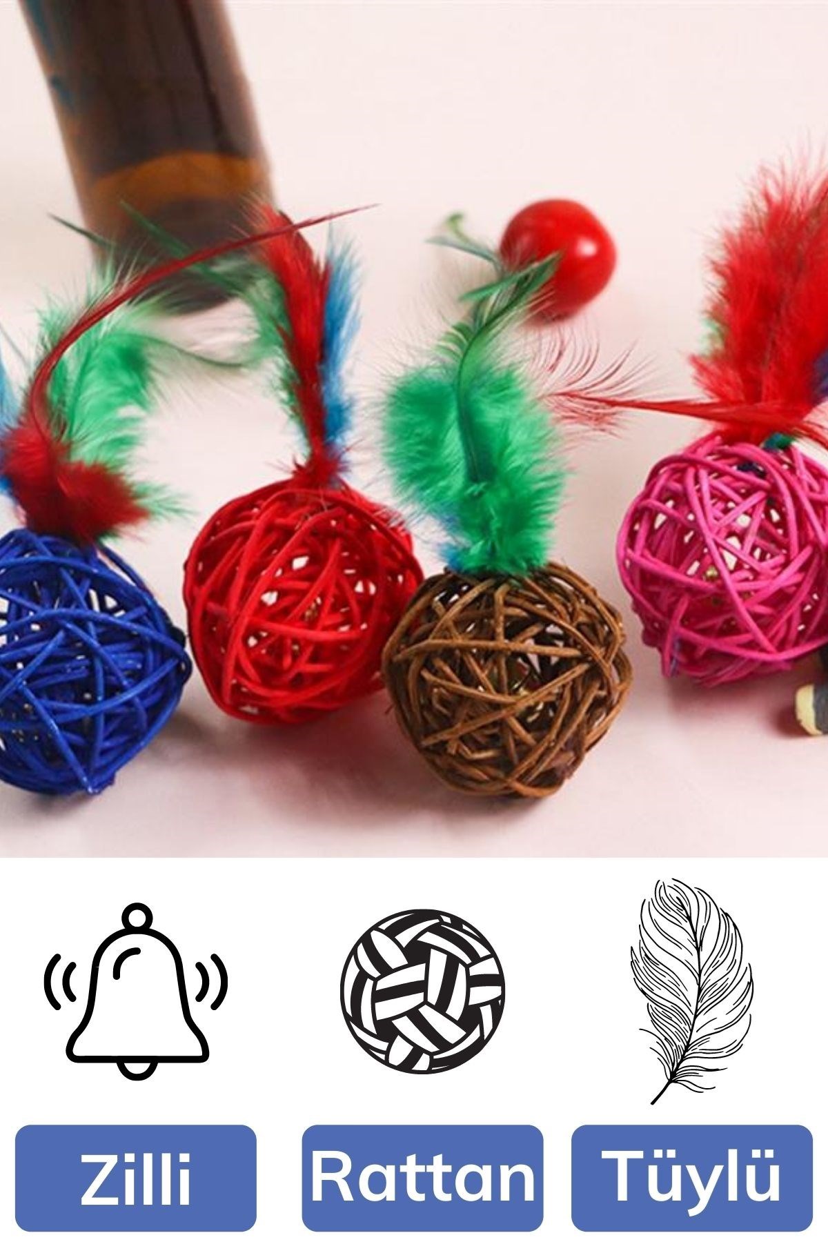 Dahili Çan --- Evcil hayvanınızın oynamasını ve evcil hayvanla etkileşimini artırabilen renkli tüy ve yerleşik zillere sahip bu toplar