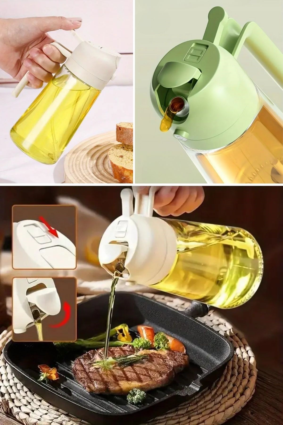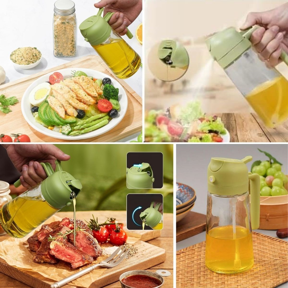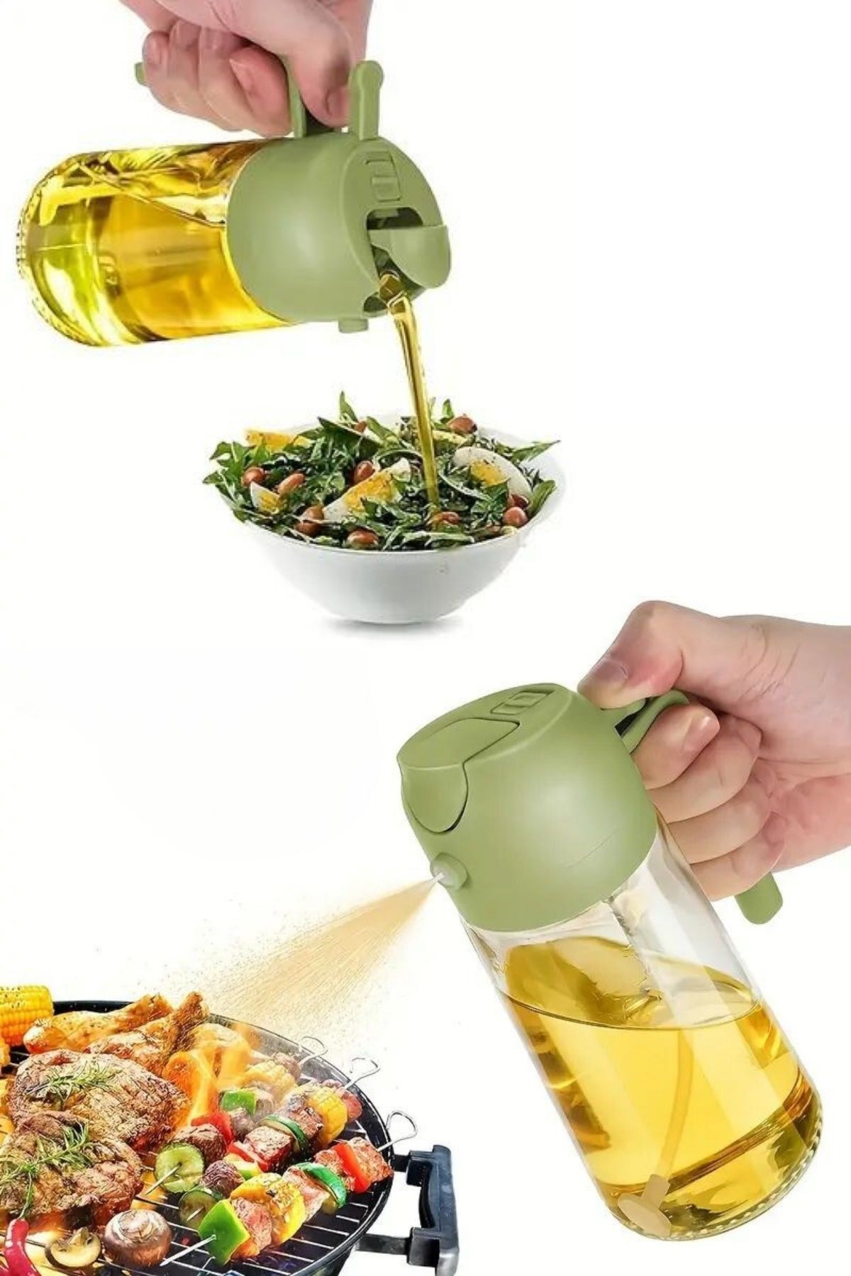 1. Çift İşlevli Kullanım: Tek bir dokunuşla yağı dökebilir veya ince bir şekilde püskürterek yemeğin her köşesine eşit olarak dağıtabilirsiniz. Salatalarda hafif bir sprey, etlerde ise yoğun bir lezzet sunmak için mükemmel!