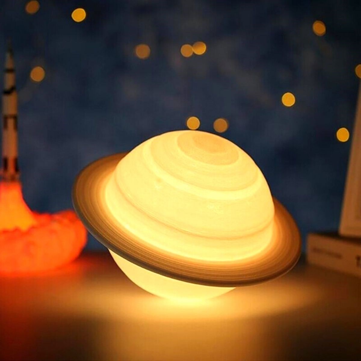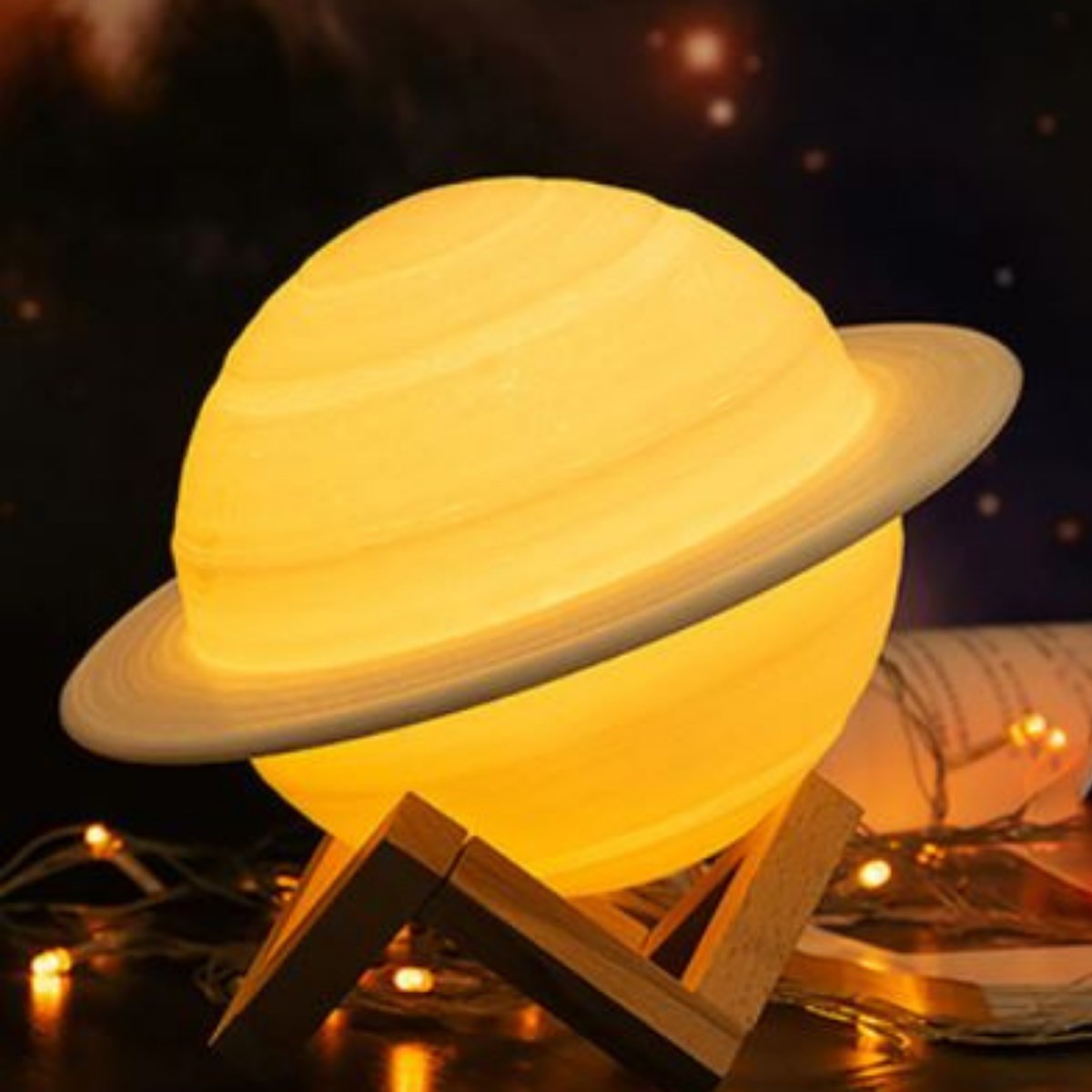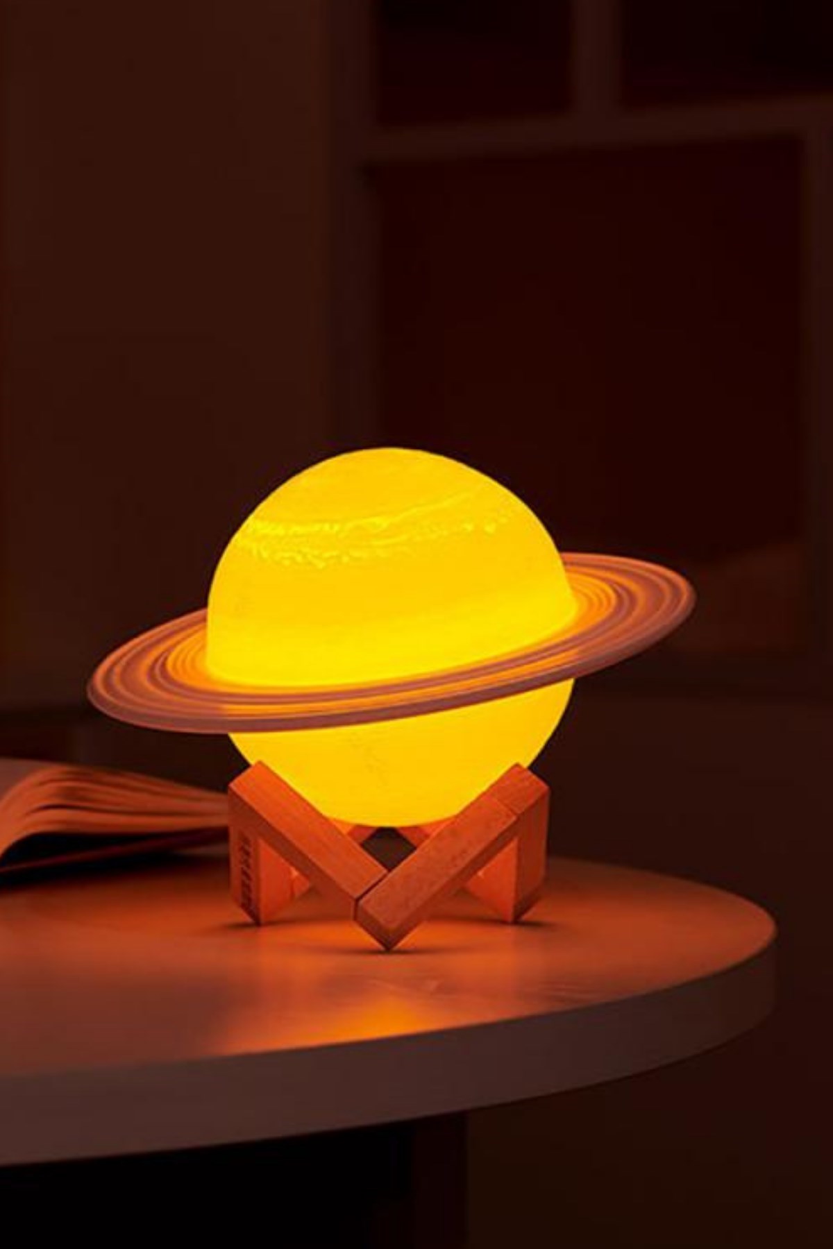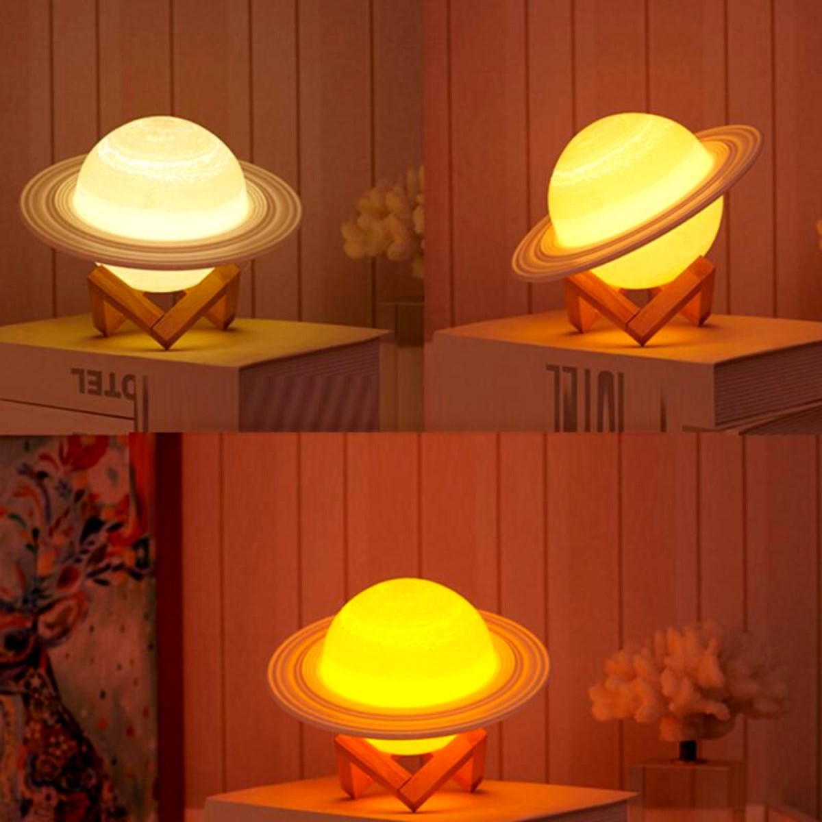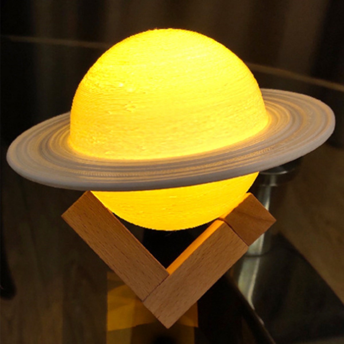 BUFFER® 3D Print Satürn Dokunmatik Gezegen Ahşap Stantlı 3 Renk USB Şarjlı Gece Lambası (Kumandasız)