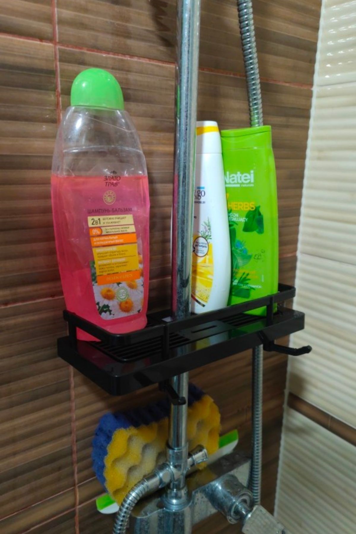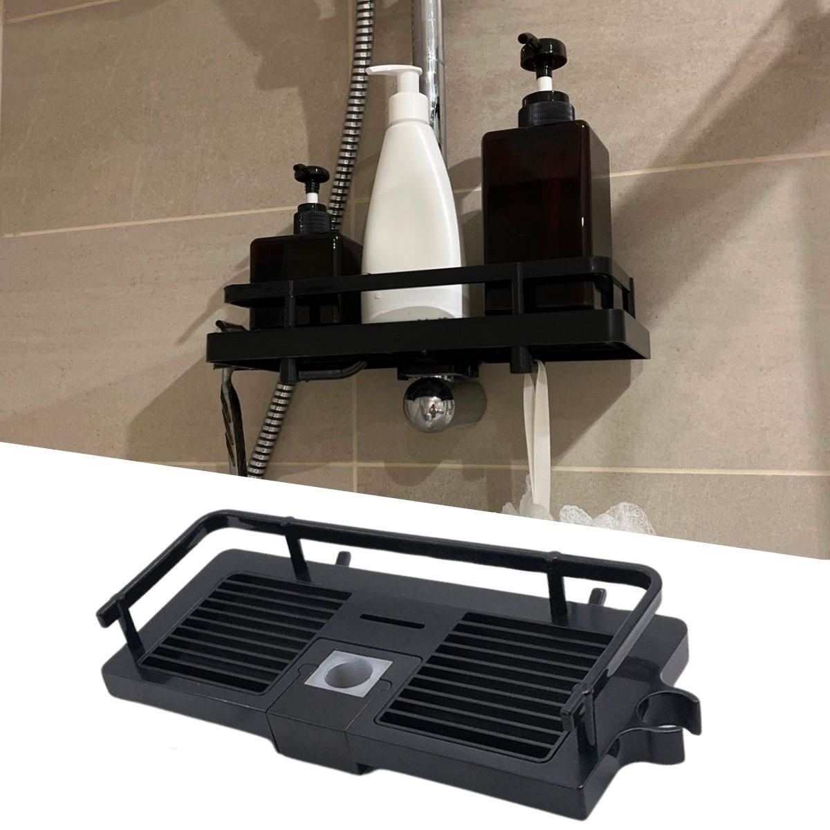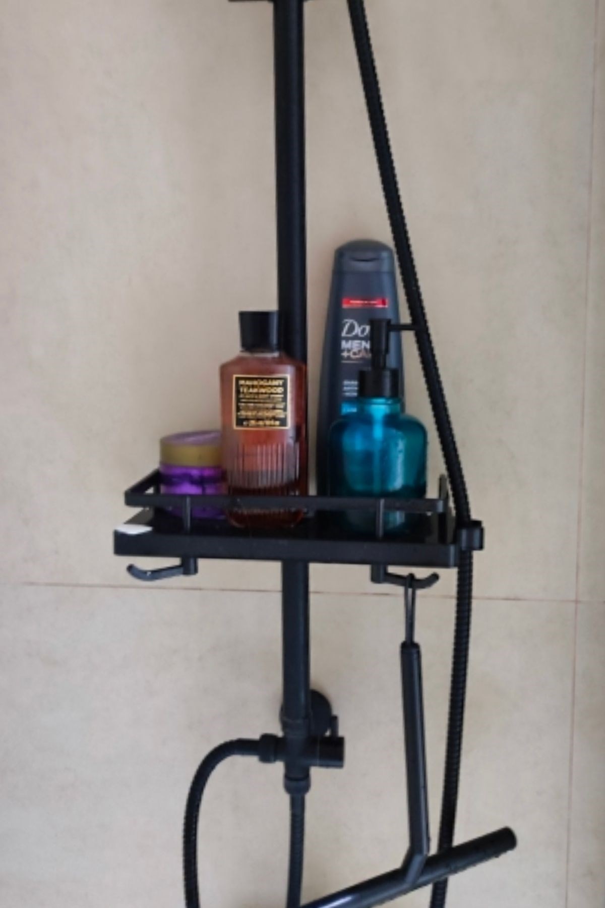 Banyonuzun düzenini sağlamak artık daha kolay ve şık! Bu duş demirine takılan siyah duş sabunluk organizeri, şampuan, sabun, lif ve diğer banyo malzemelerini düzenli bir şekilde saklamanızı sağlayan pratik bir çözümdür.