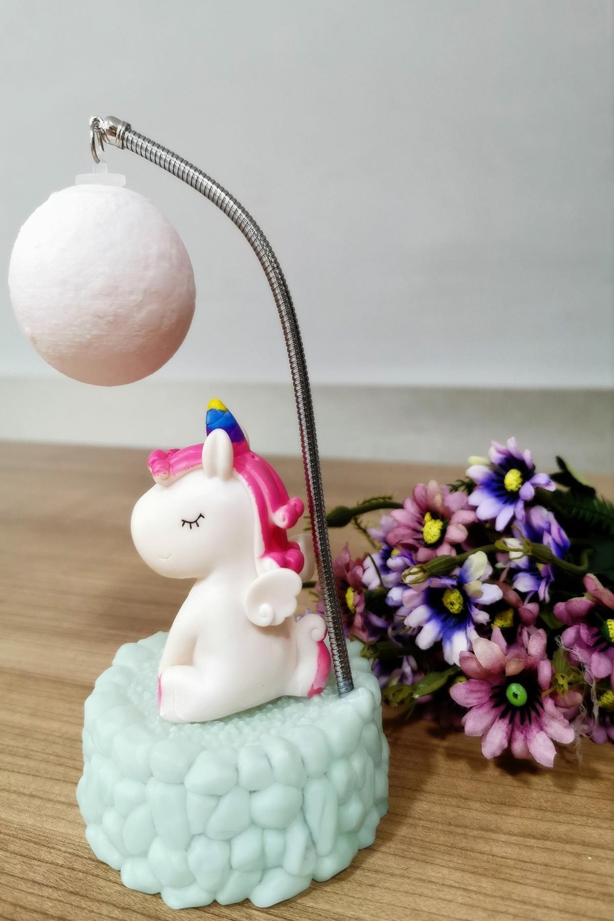 Unicornlu Gece Lambası Aydınlatmasının altındaki ışık renk değiştirerek yanıp sönerken üzerindeki askıya takılı olan lamba da beyaz olarak aydınlatma sağlamaktadır