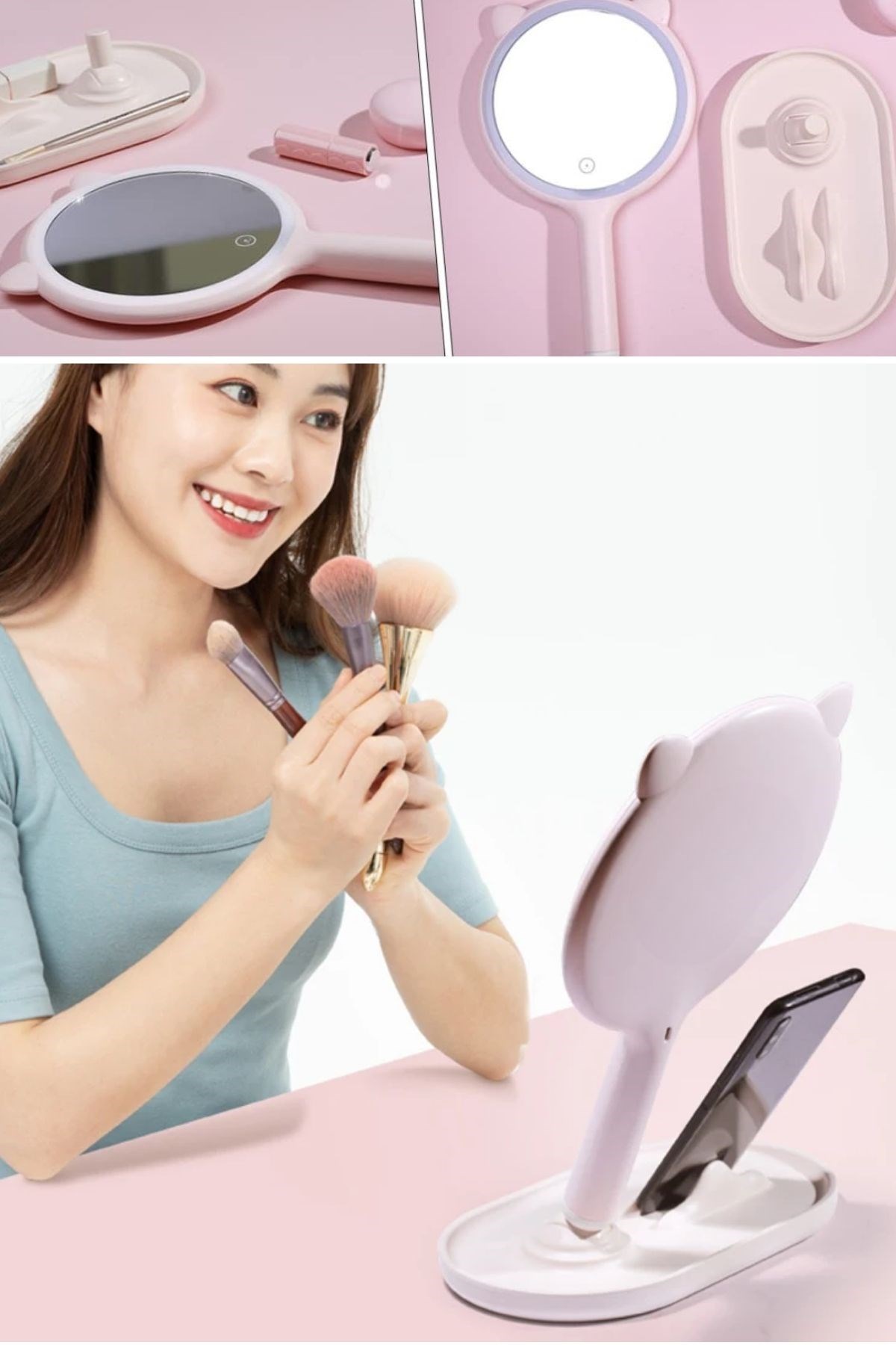 BUFFER® Kedi Kulaklı Telefon Standlı Yuvarlak Dokunmatik Led Ayarlı Masa Üstü Makyaj Aynası