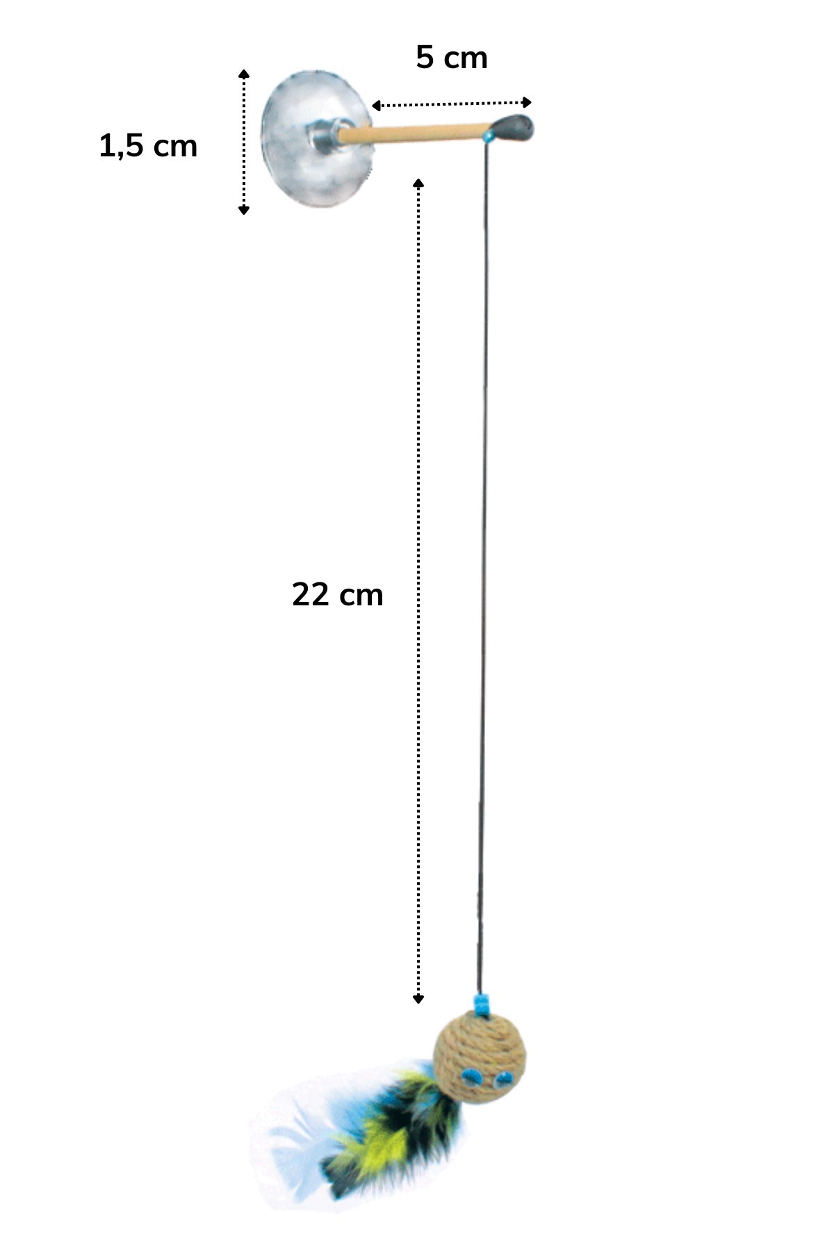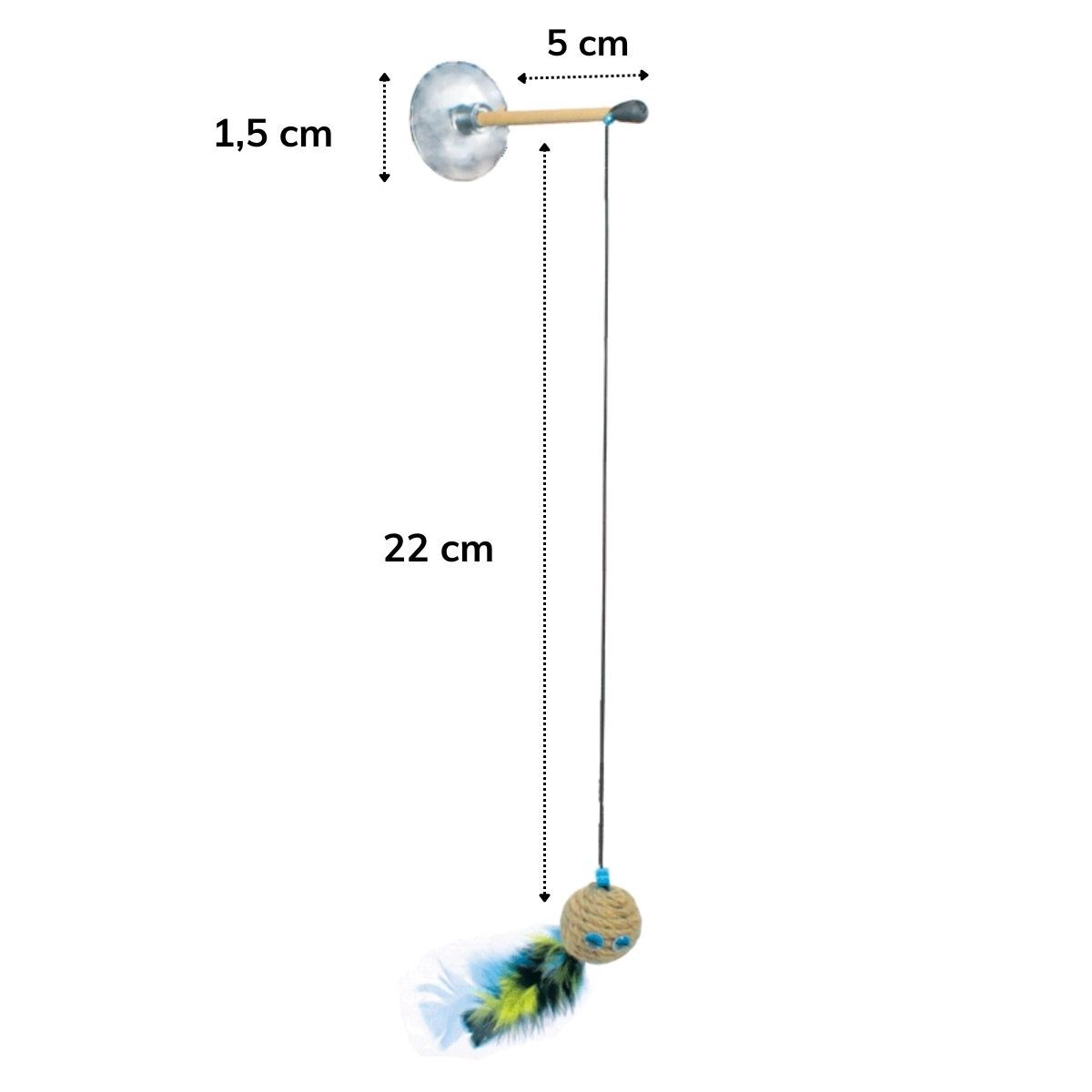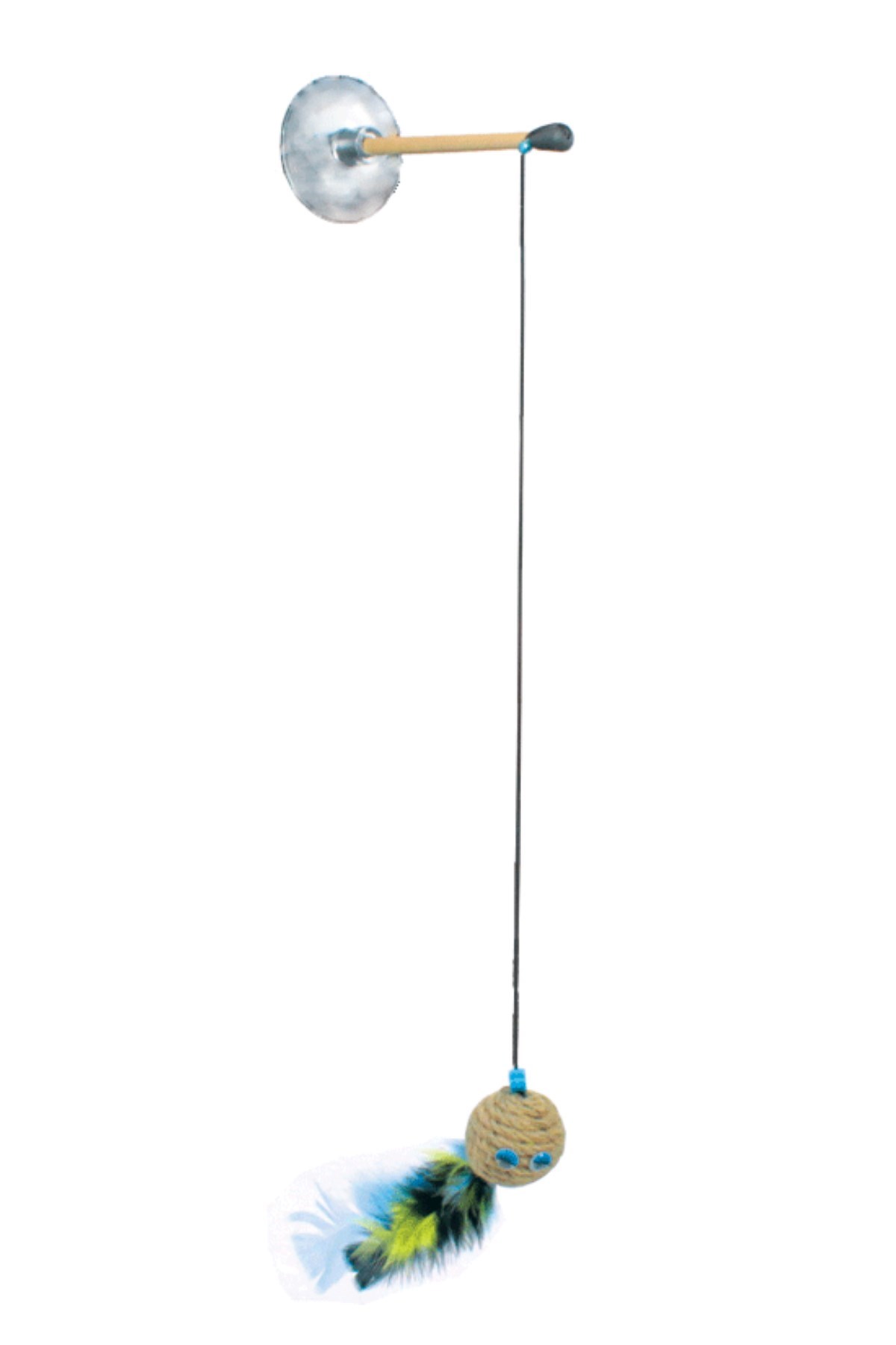 Kedi oyuncağı bir ip, tüylü bir toptan ve bir vantuzdan yapılmıştır Minik dostlarımız için üretilen çevre dostu oyuncak kedileriniz için tamamen güvenilirdir