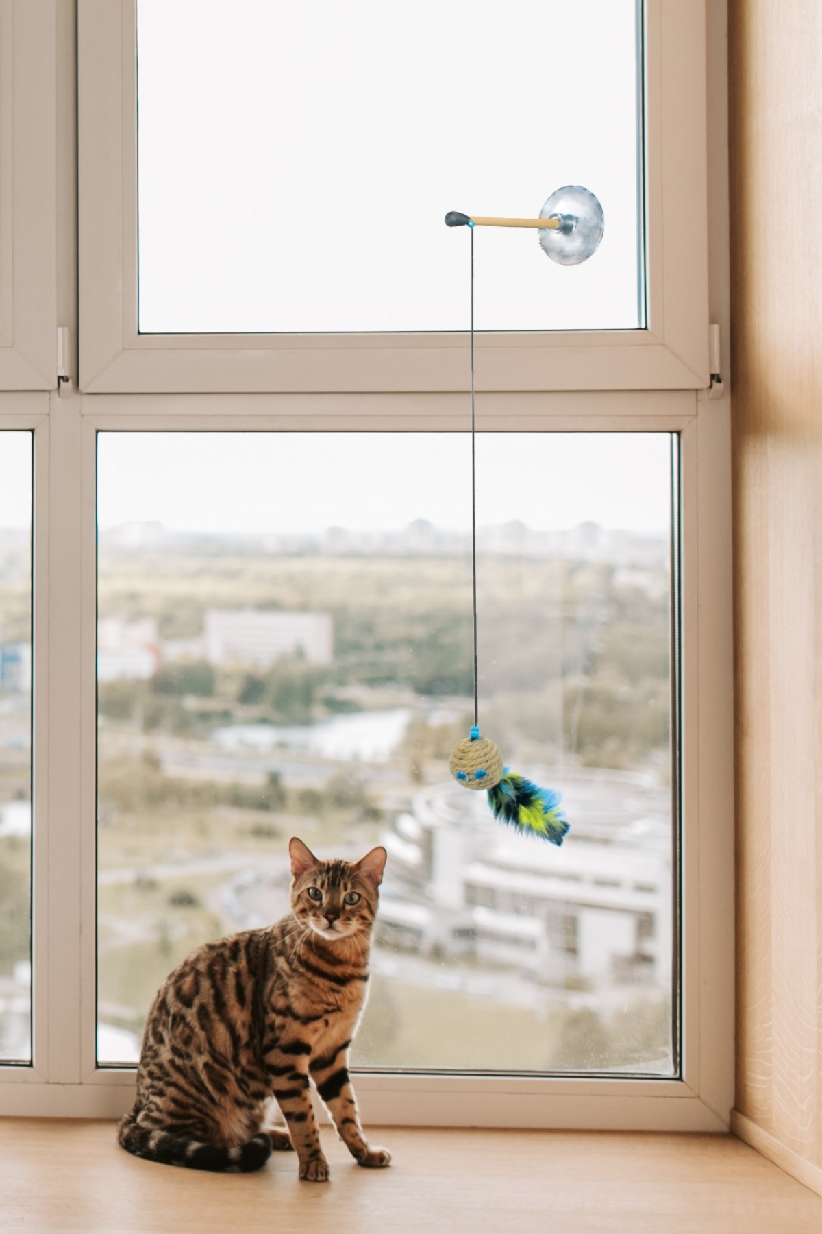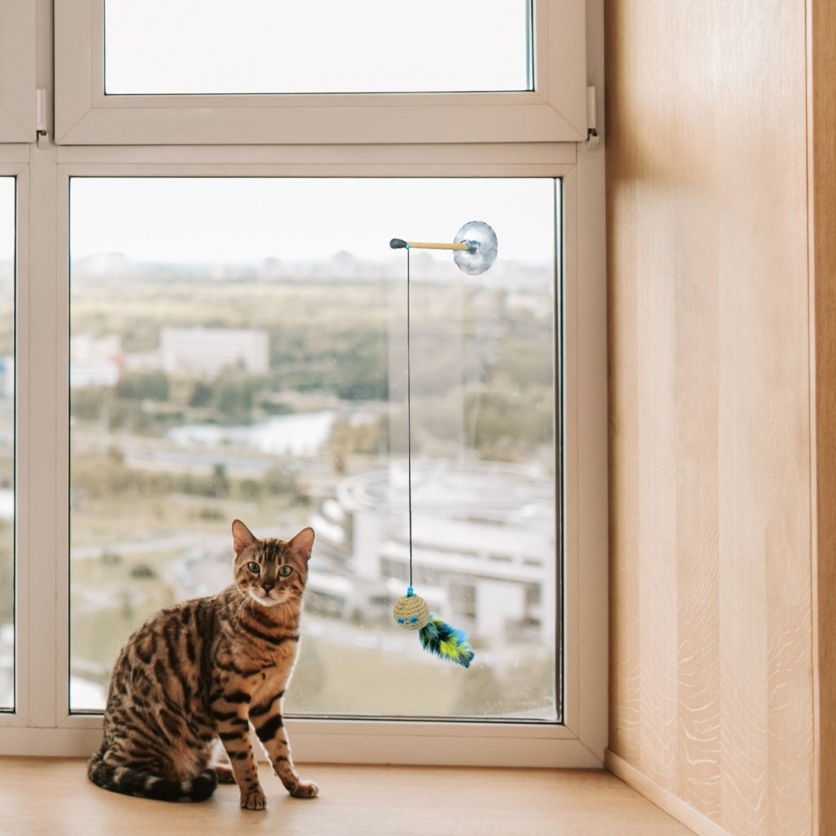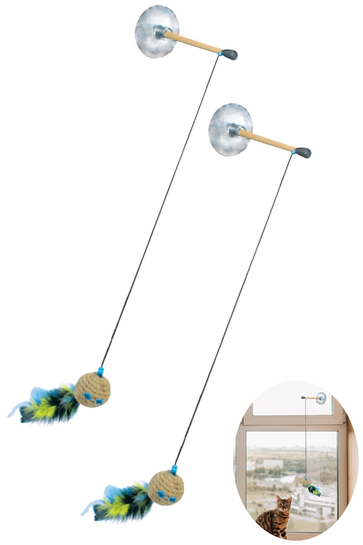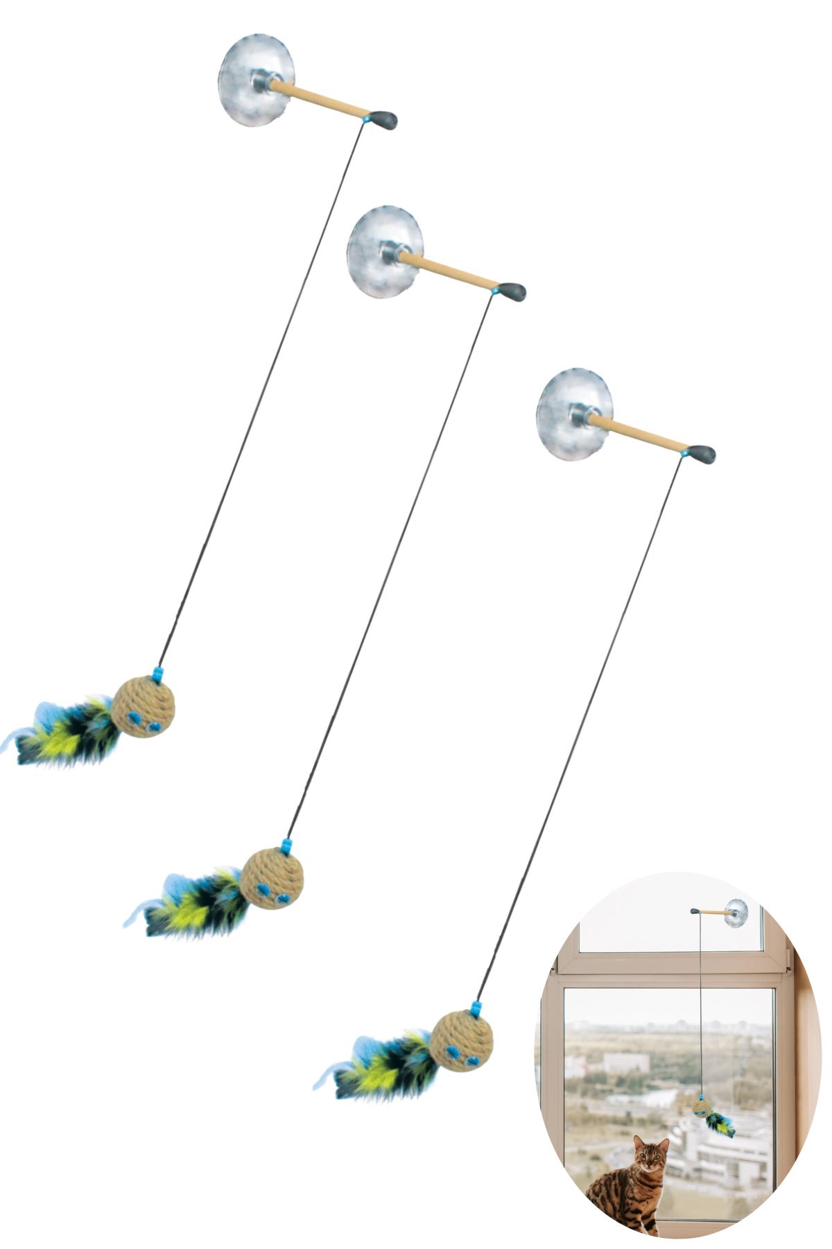Kedi oyuncağı bir ip, tüylü bir toptan ve bir vantuzdan yapılmıştır Minik dostlarımız için üretilen çevre dostu oyuncak kedileriniz için tamamen güvenilirdir