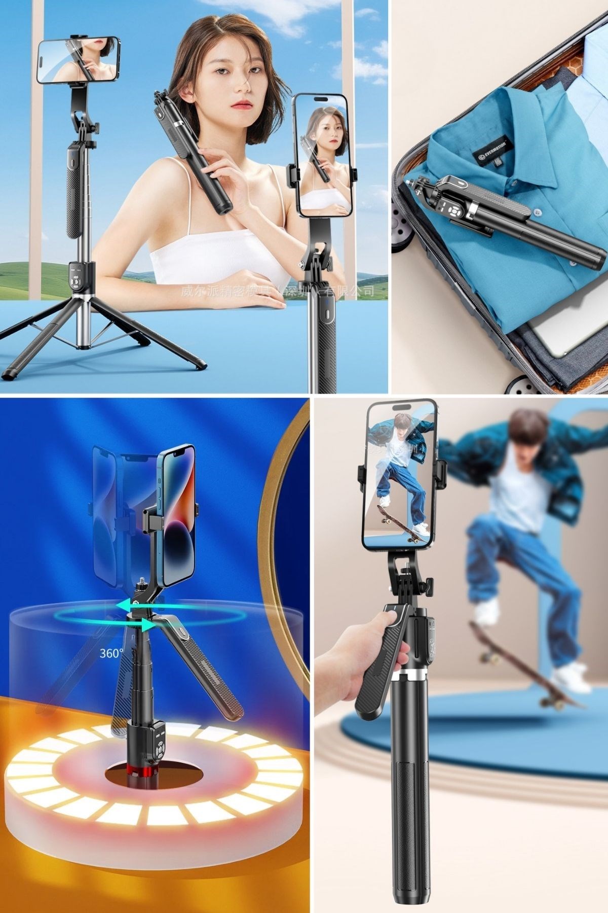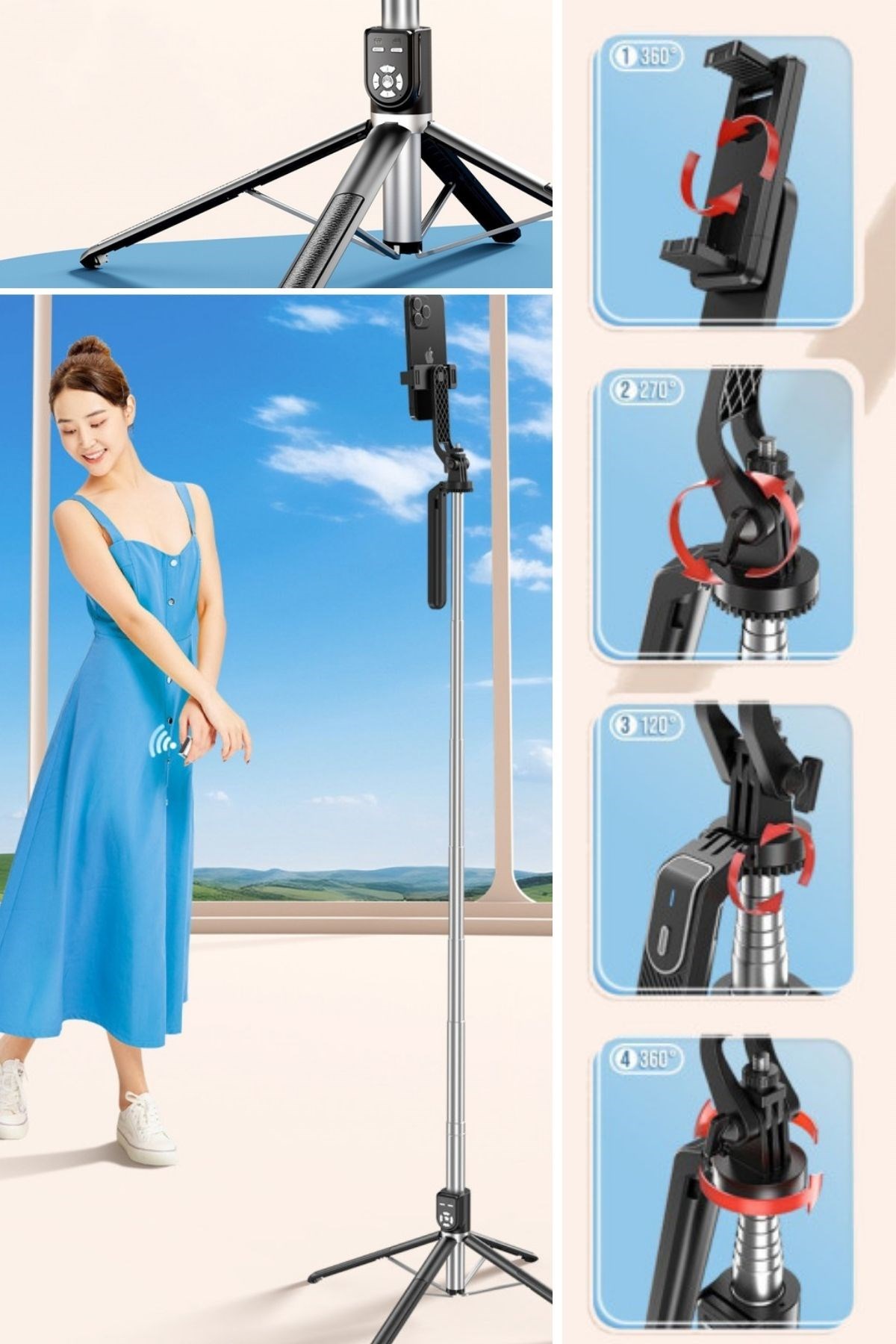 Kumandalı 360 Derece Dönebilen Cep Telefonu ve Kamera Tripodu, mükemmel fotoğraflar ve videolar çekmenizi sağlayan çok yönlü bir aksesuardır. Hem profesyoneller hem de amatör kullanıcılar için ideal olan bu tripot, aynı zamanda 2.2 metreye kadar uzayabilen bir selfie çubuğu olarak da kullanılabilir. Kumanda ile kontrol edilebilen 360 derece dönebilme özelliği, her açıdan çekim yapmanızı mümkün kılar.