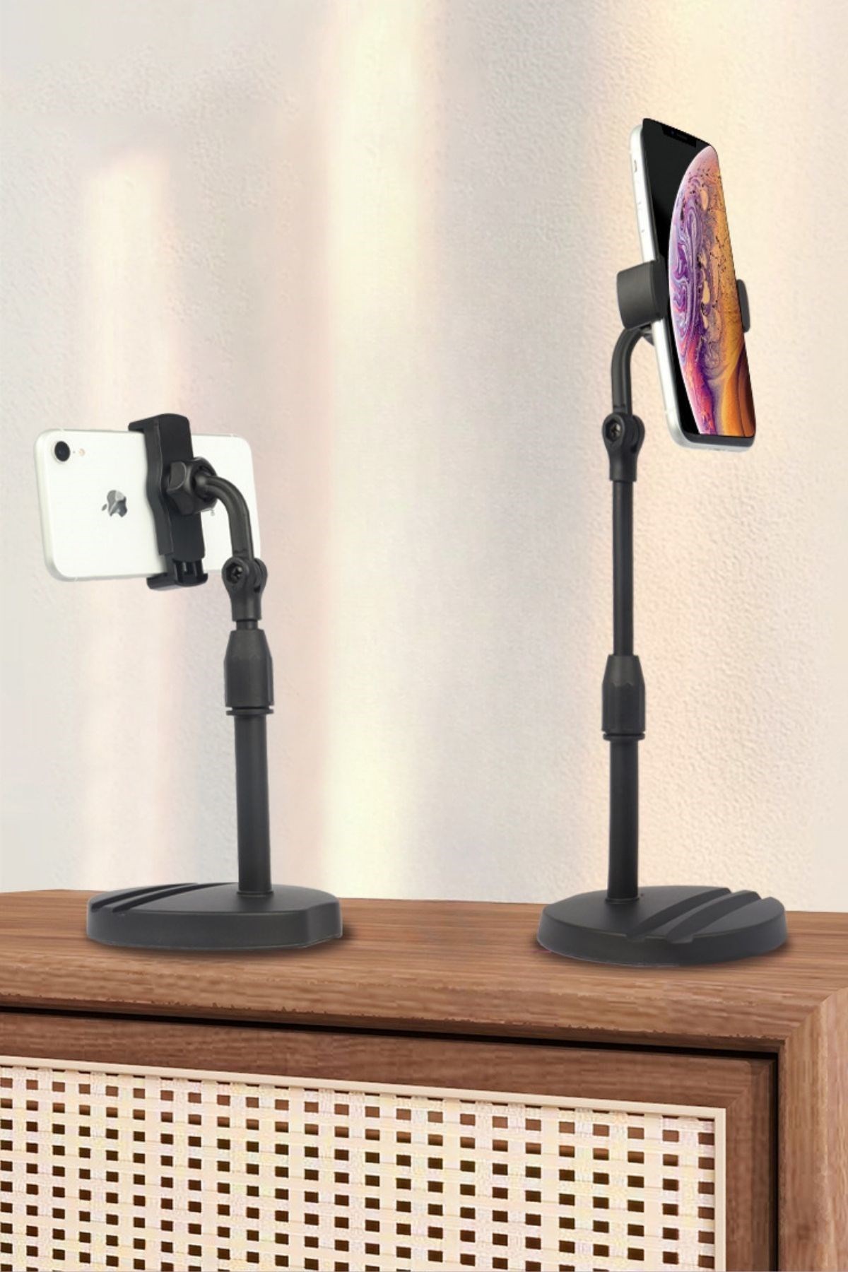 Masa Üstü Tablet ve Telefon Tutucu Plastik Aparat, siyah renkli şık tasarımı ile hem tablet hem de telefonlarınız için ideal bir stand çözümüdür. Çalışma masasında, mutfakta, yatak odasında veya ofiste, cihazlarınızı dik ya da yatay konumda sabit tutarak kullanım kolaylığı sağlar.