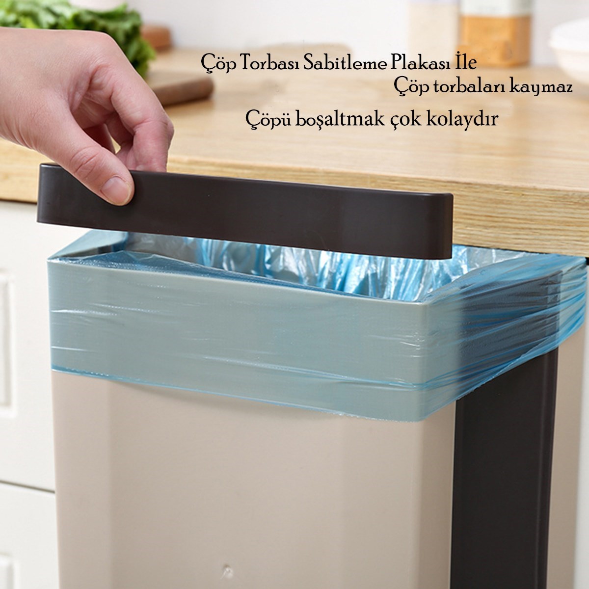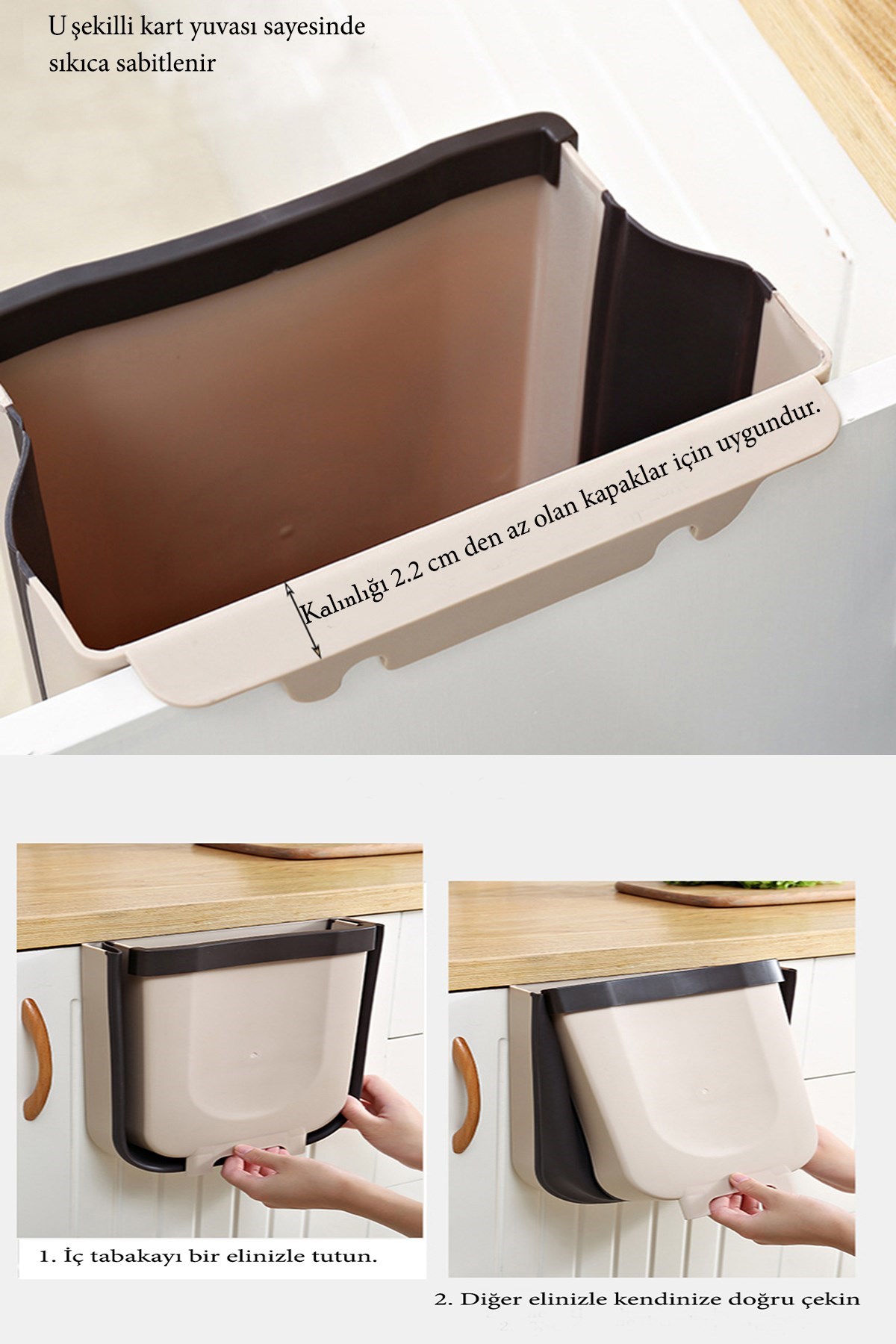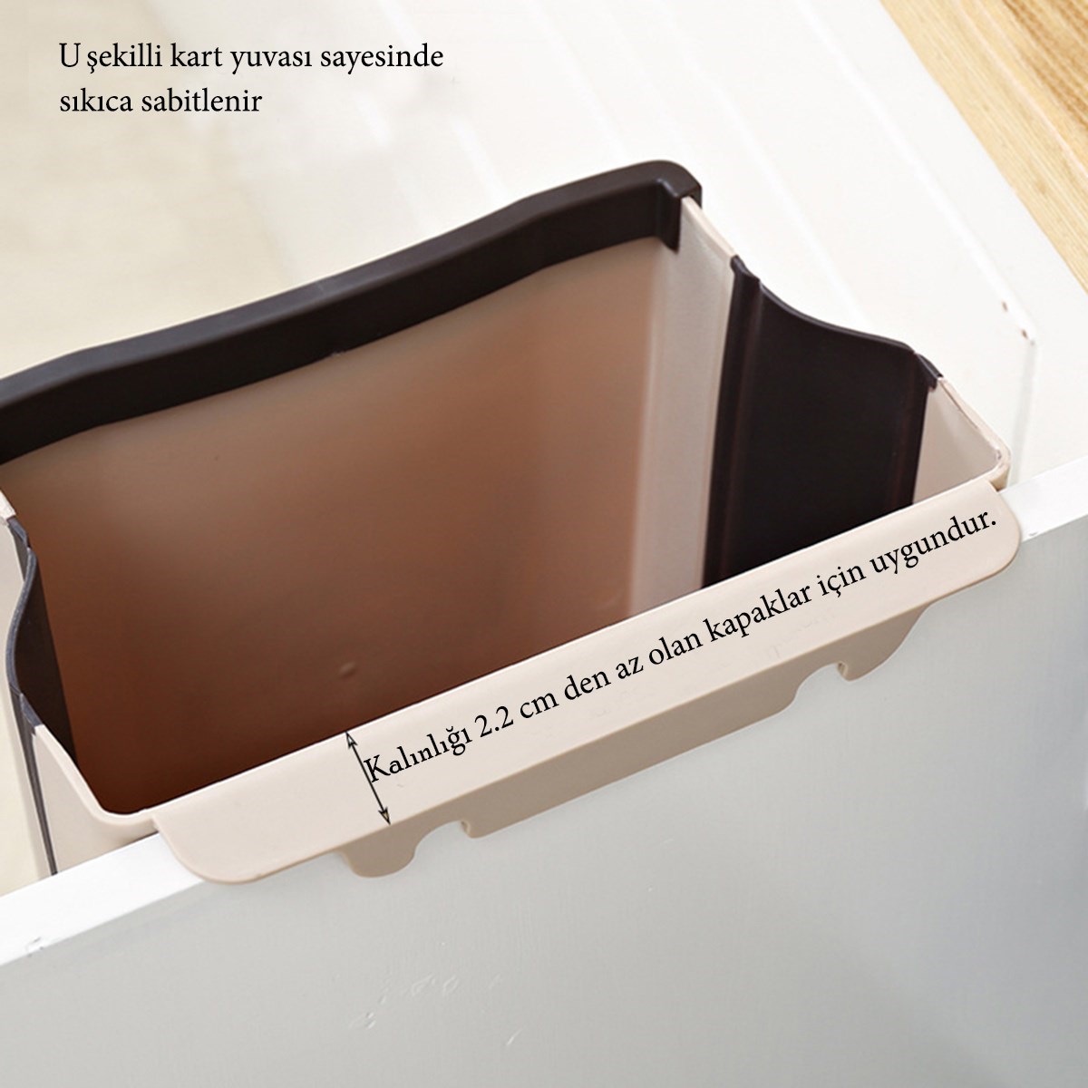 Askılı çöp kovaları dolap kapısına, kiler kapısına, çekmeceye arabaya veya kalınlığı 22 cm den az olan her yere asılabilir