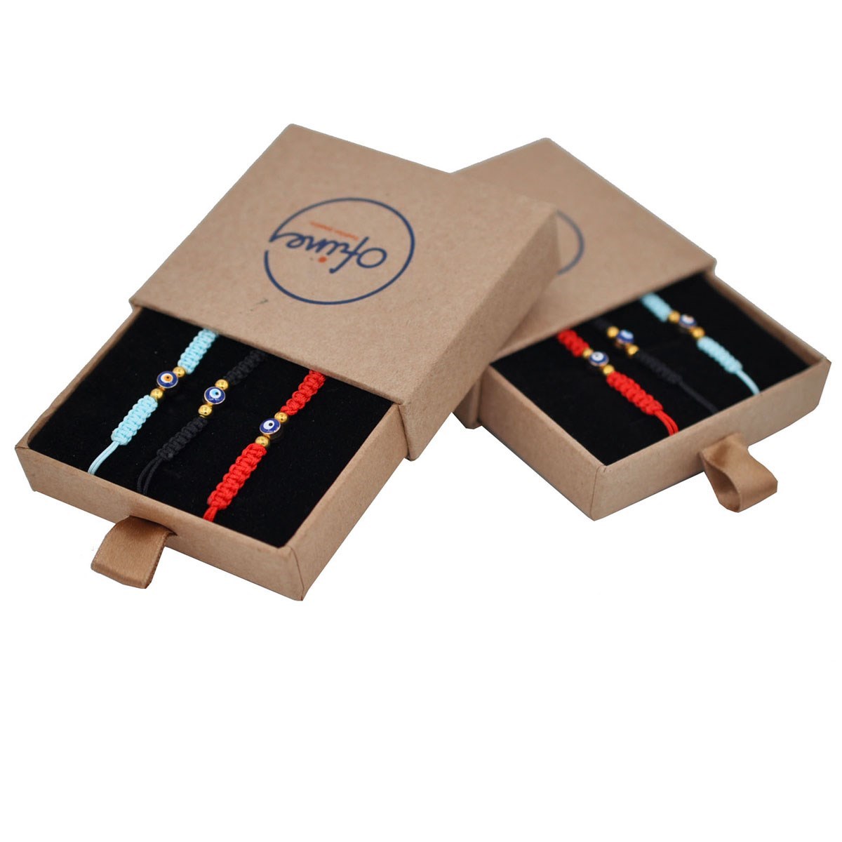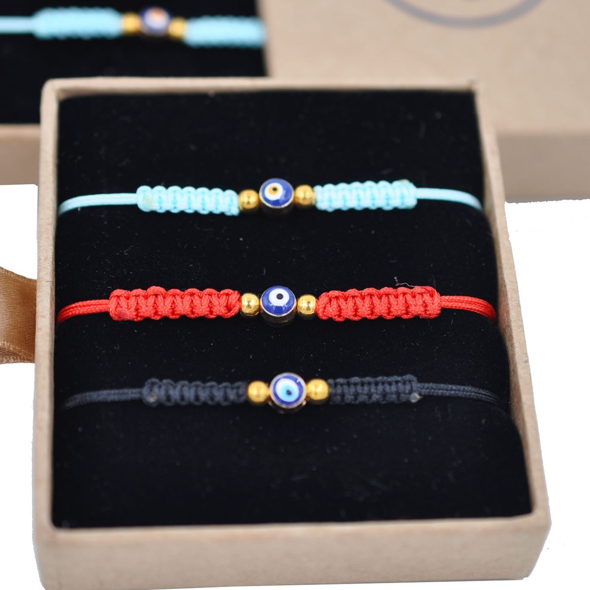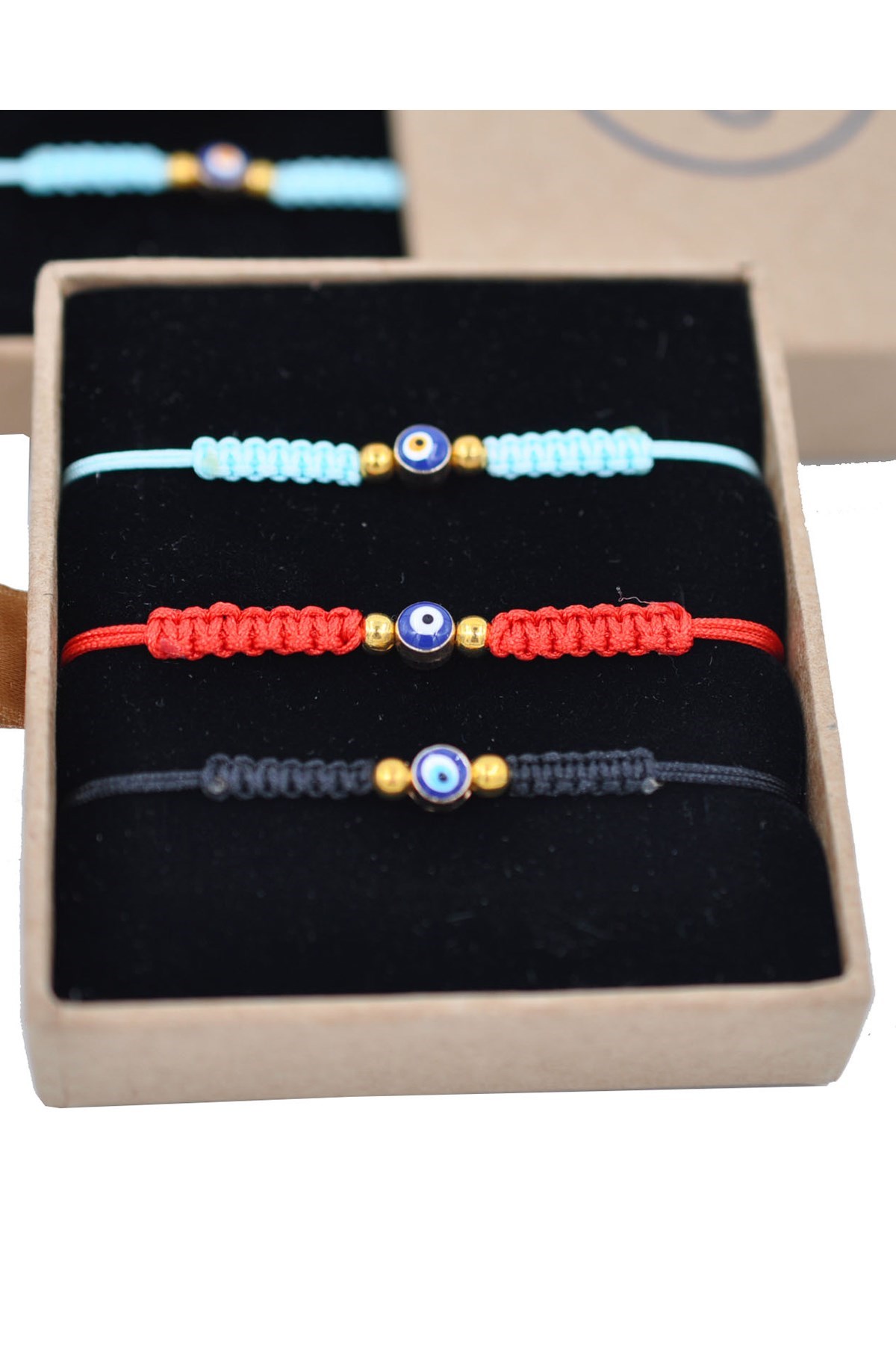Ürünümüz sevdiklerinize şans ve uğur getirmesi için tek adet küçük nazar boncuğu içermekle beraber tek bir kutuda nazar boncuklu örme kırmızı, mavi ve siyah ip bileklikleri içermektedir