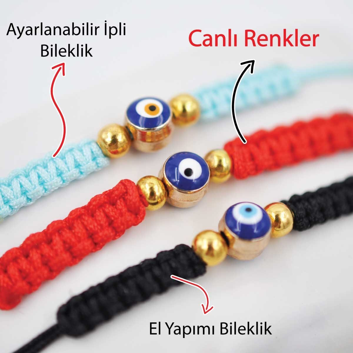 Nazar boncuklu 3 farklı renk örgü ip bilekliğin ayarlanabilir, örgülü olması ve her bileğe uygun olması size kolaylık sağlamaktadır