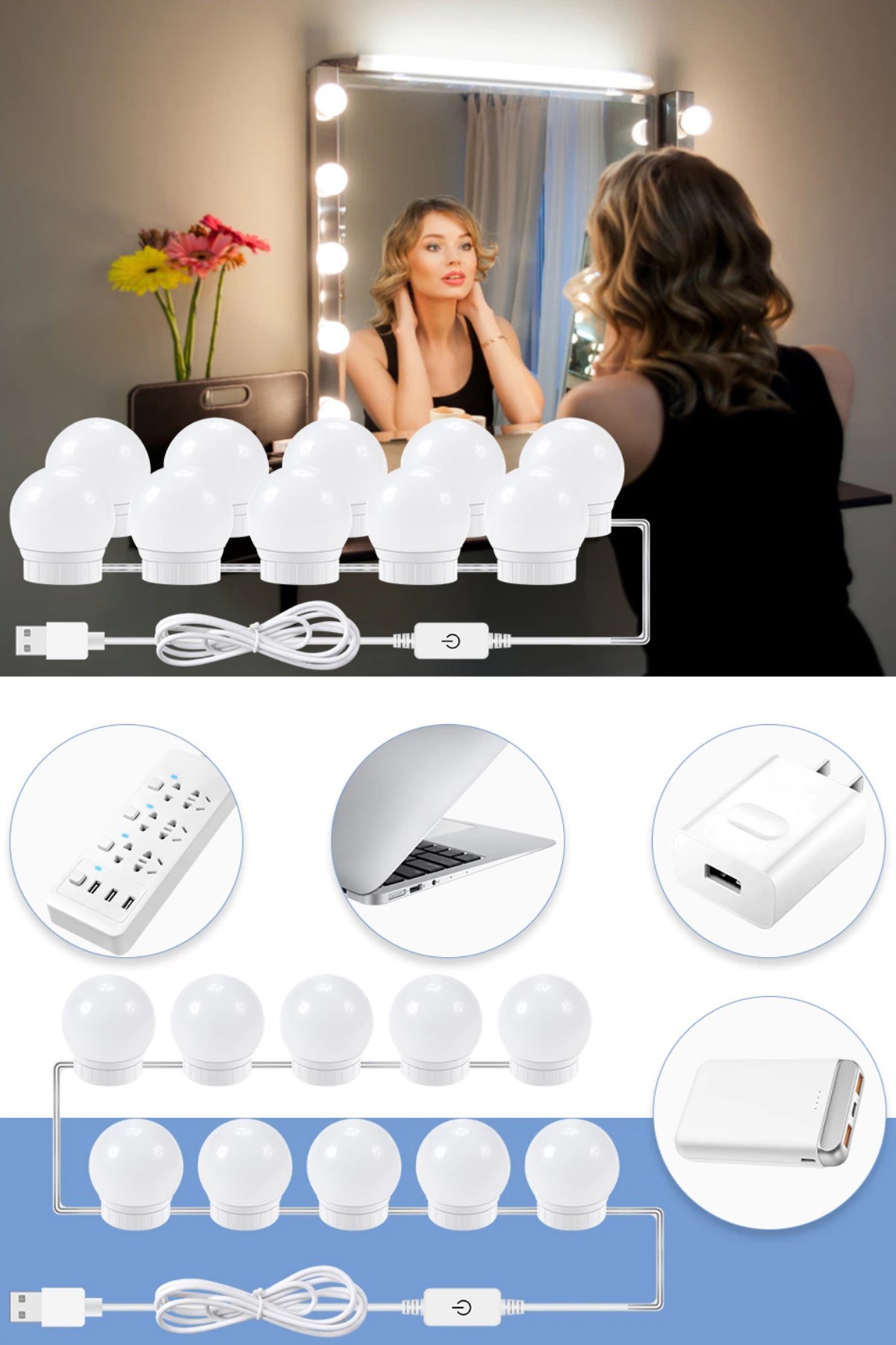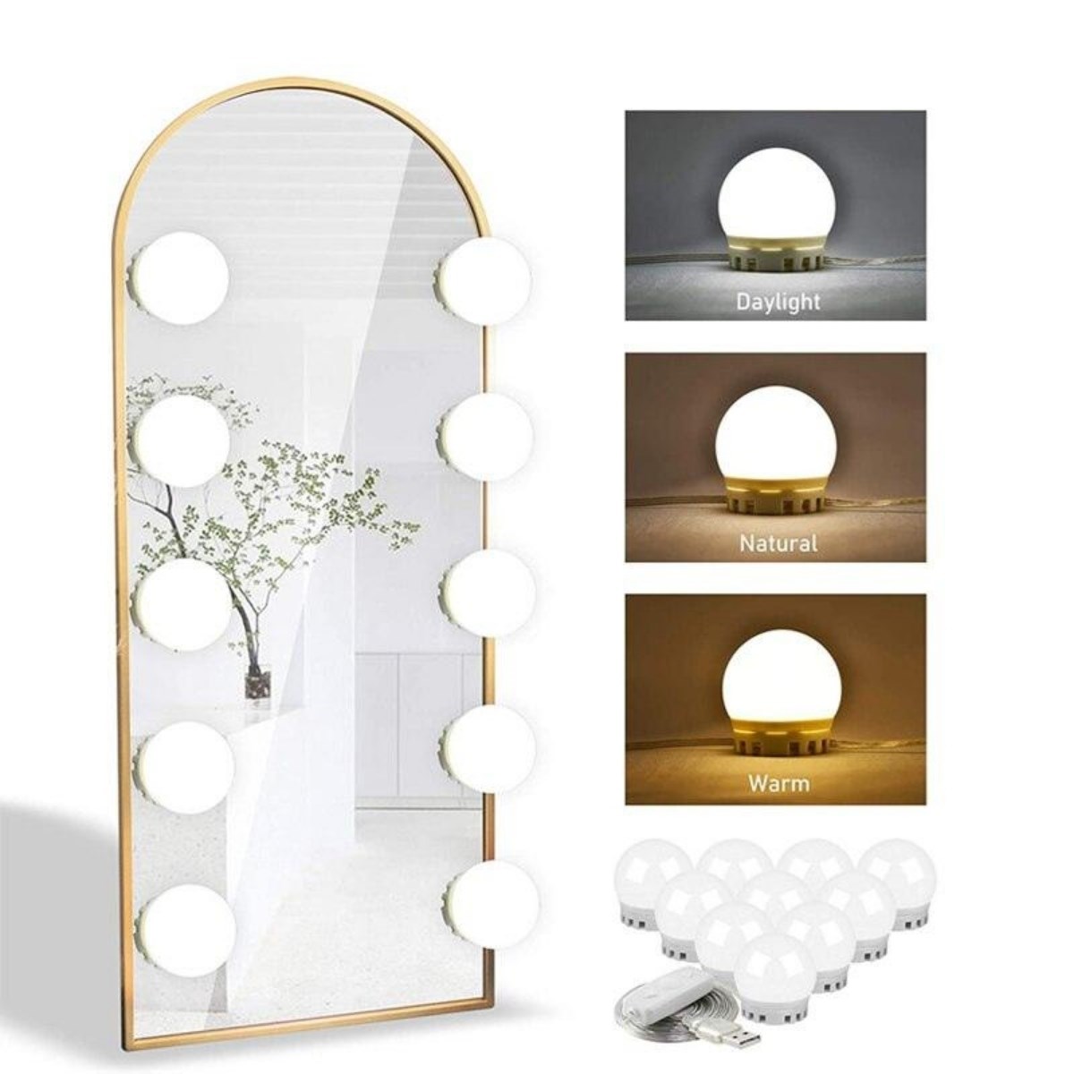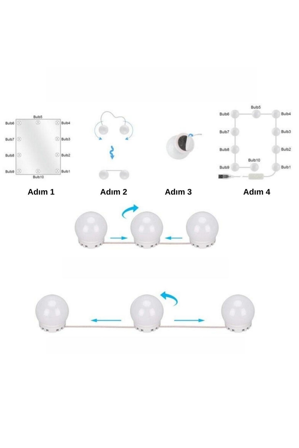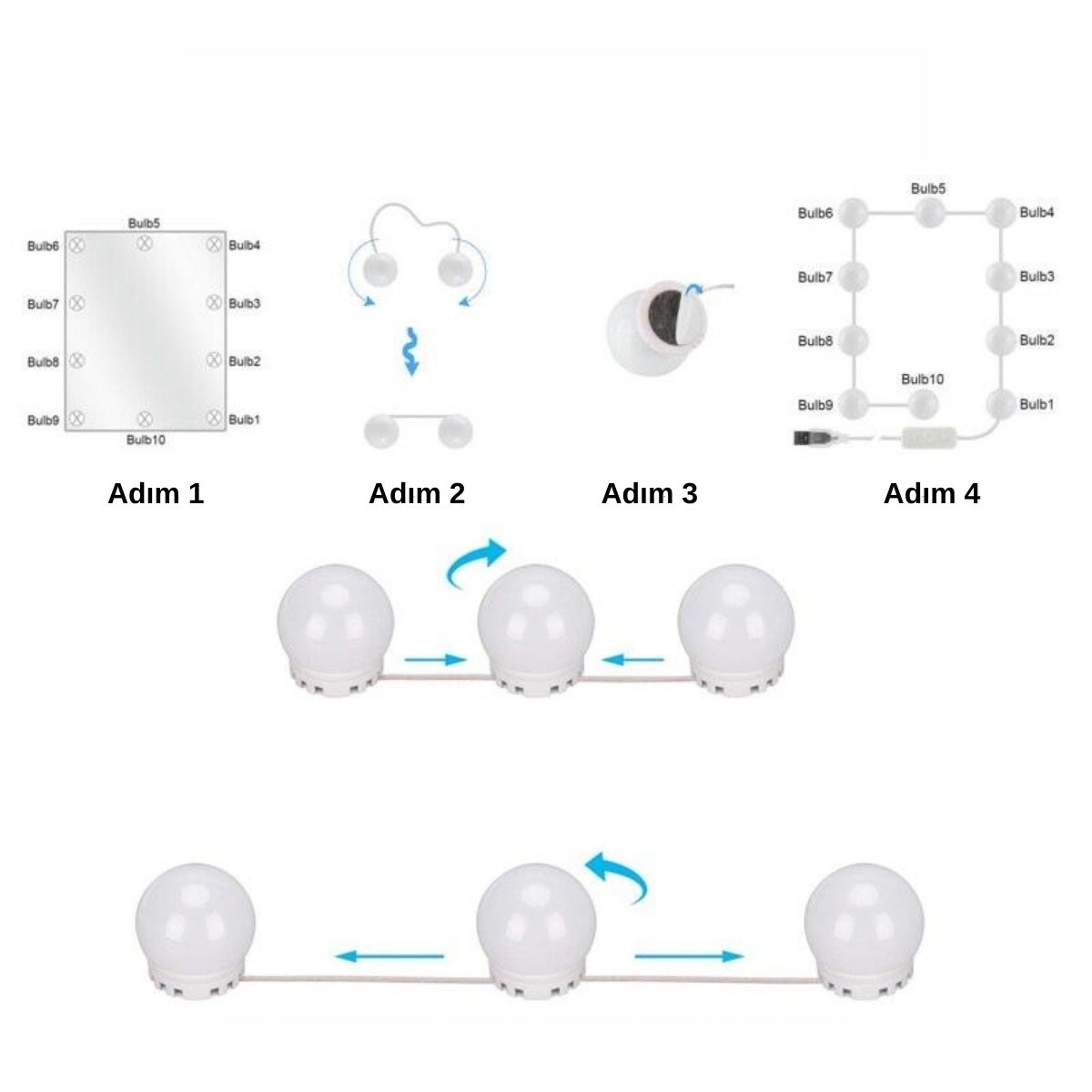 BUFFER® Nostalji Hollywood Tarzı 10lu Makyaj Masası Aynası Beyaz Led Işıklı Lamba USB