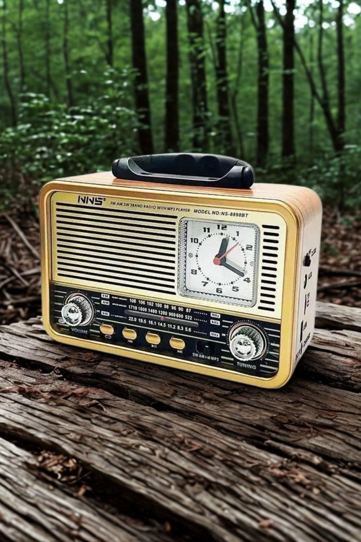BUFFER® Orta Boy Saat Göstergeli Retro Ahşap Tasarım Bluetooth Hoparlörlü Radyo – FM/AM Destekli, Şarjlı ve Taşınabilir (NS-8898)