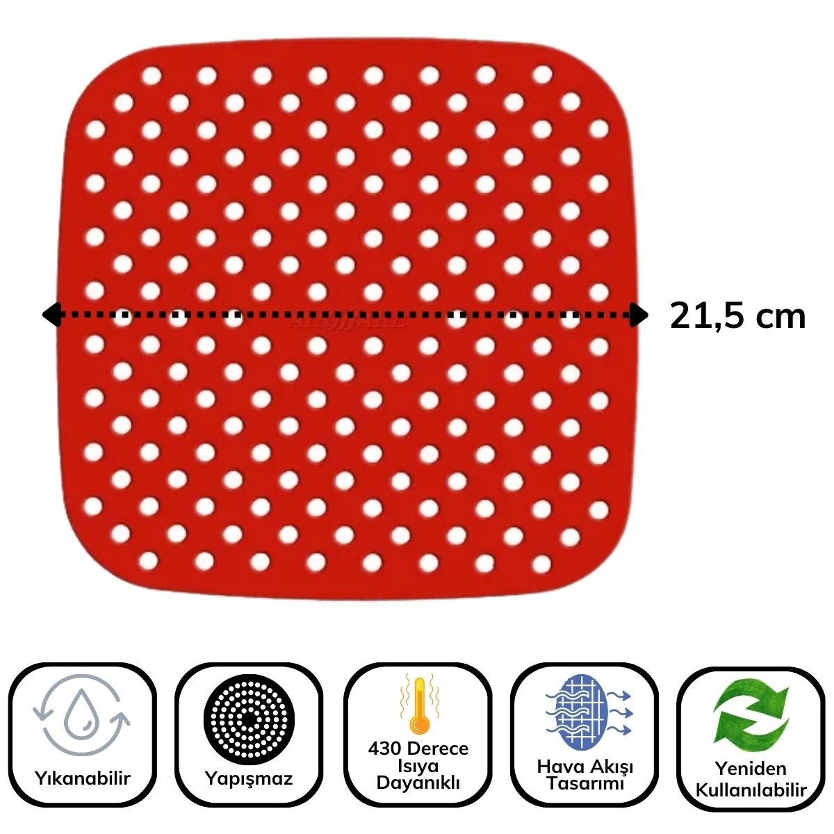 Slikon pişirme matı 21,5 cm uzunluğunda ve kare yapıdadır. Kırmızı ve siyah olmak üzere 2 farklı rengi bulunur. Delikli yapısı sayesinde yemeğiniz pişerken aşırı kokuyu önler.