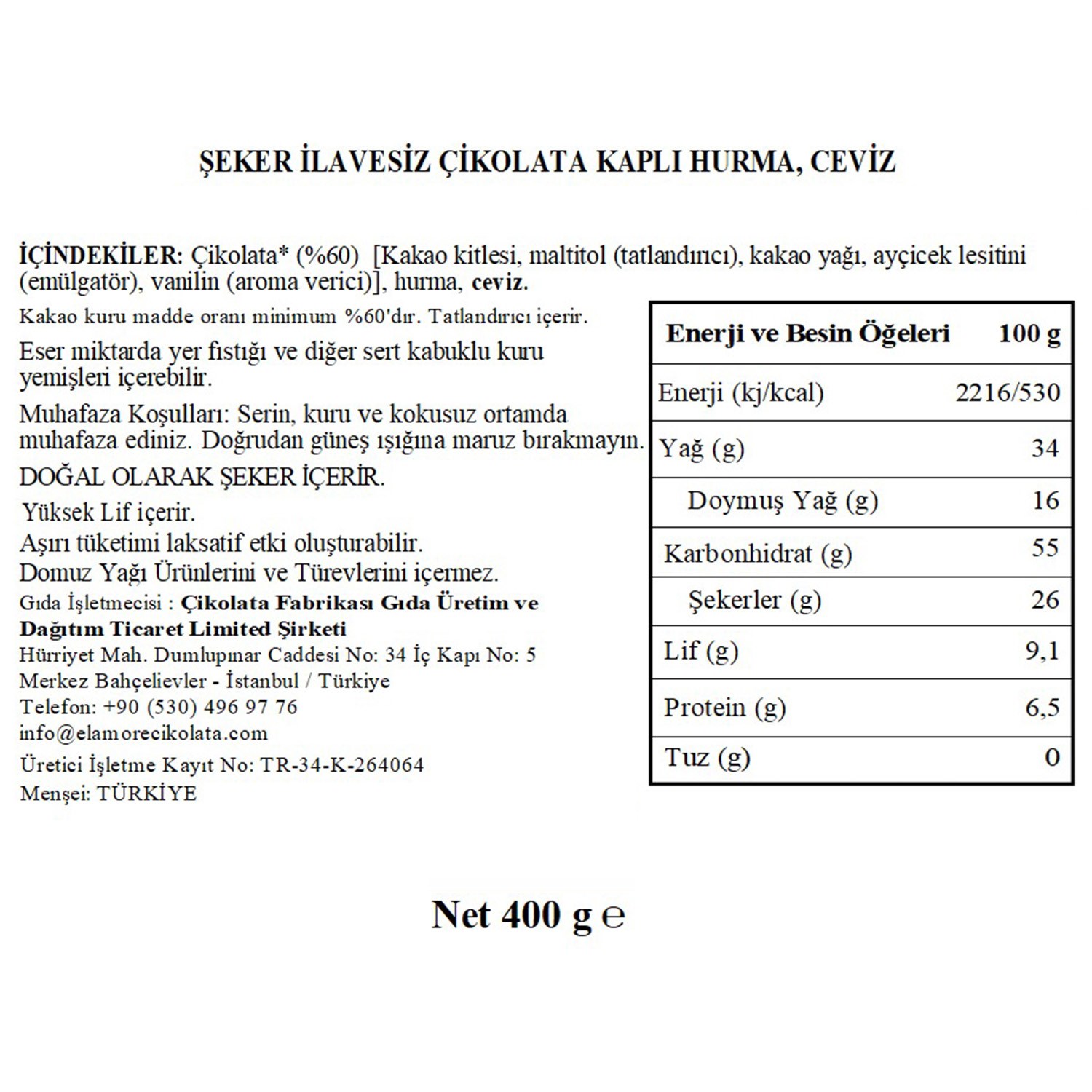 Elamore Çikolata, şeker ilavesiz, glütensiz, vegan formülüyle yoğun kakao lezzetini Belçika ustalarının tarifleriyle buluşturuyor. %60 kakao oranına sahip gerçek bitter çikolata ile kaplanan hurma ve ceviz tatlı ihtiyacınızı benzersiz bir deneyime dönüştürüyor.