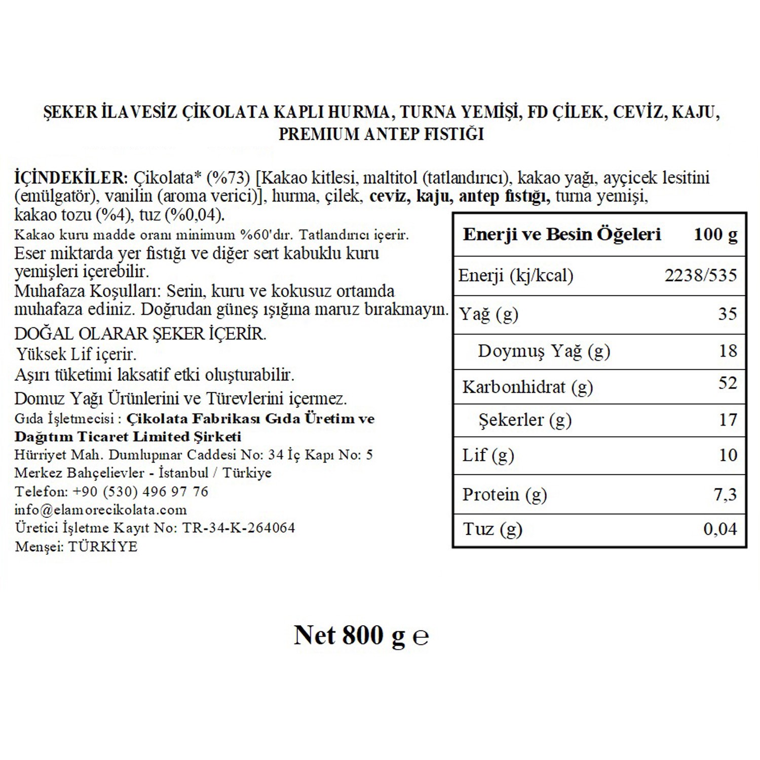 Elamore Çikolata, şeker ilavesiz, glütensiz, vegan formülüyle yoğun kakao lezzetini Belçika ustalarının tarifleriyle buluşturuyor. %60 kakao oranına sahip gerçek bitter çikolata ile kaplanan hurma, ceviz, kaju, turna yemişi, freeze dried çilek ve premium antep fıstığı, tatlı ihtiyacınızı benzersiz bir deneyime dönüştürüyor.