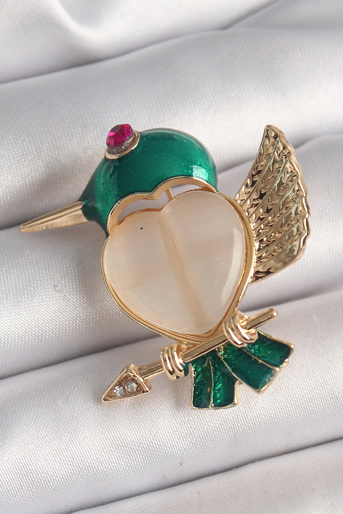 Mey İthalat® Pirinç Gold Renk Beyaz Mineli Kalp Yeşil Sinek Kuşu Model Pembe Zirkon Taş Detay Kadın Broş