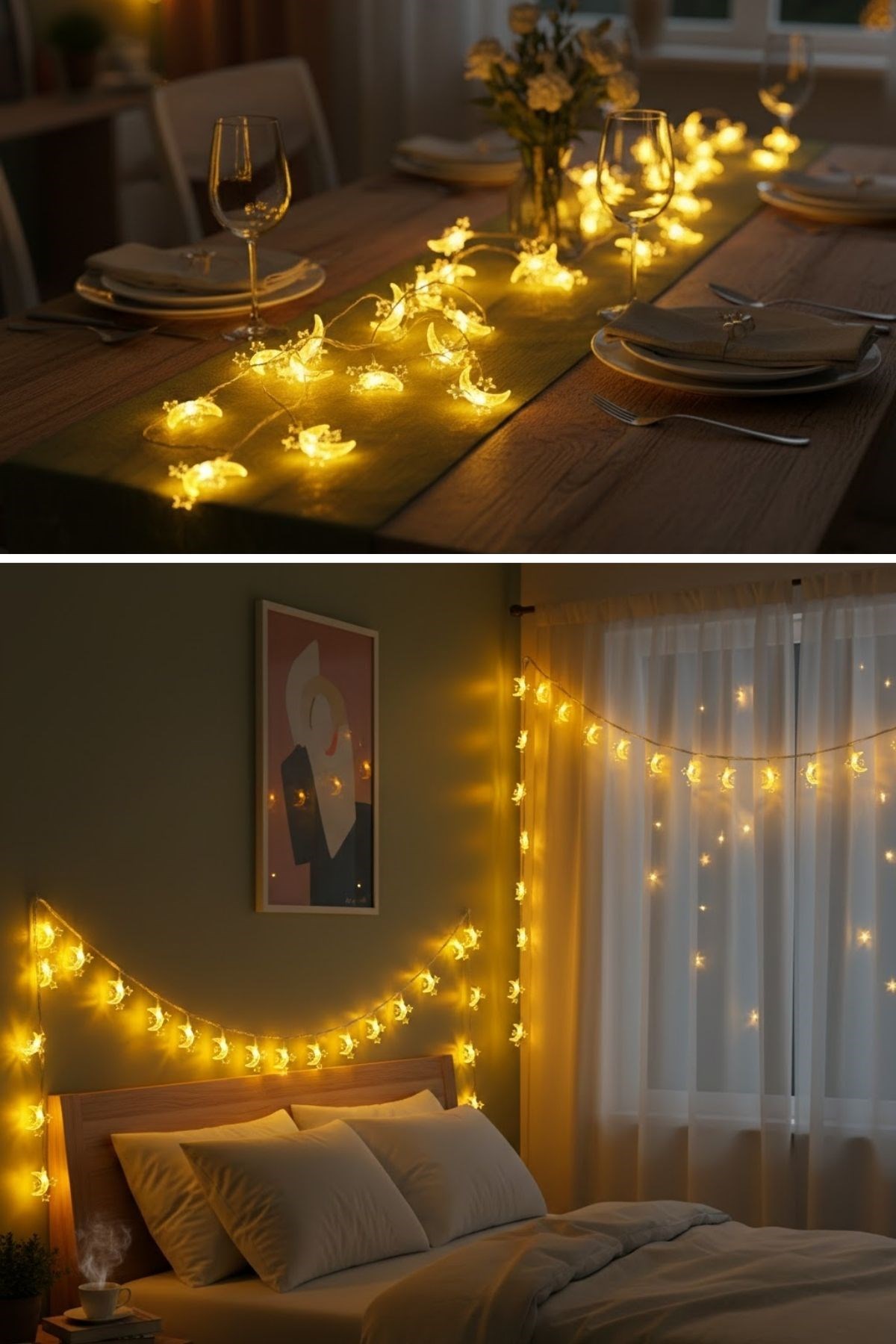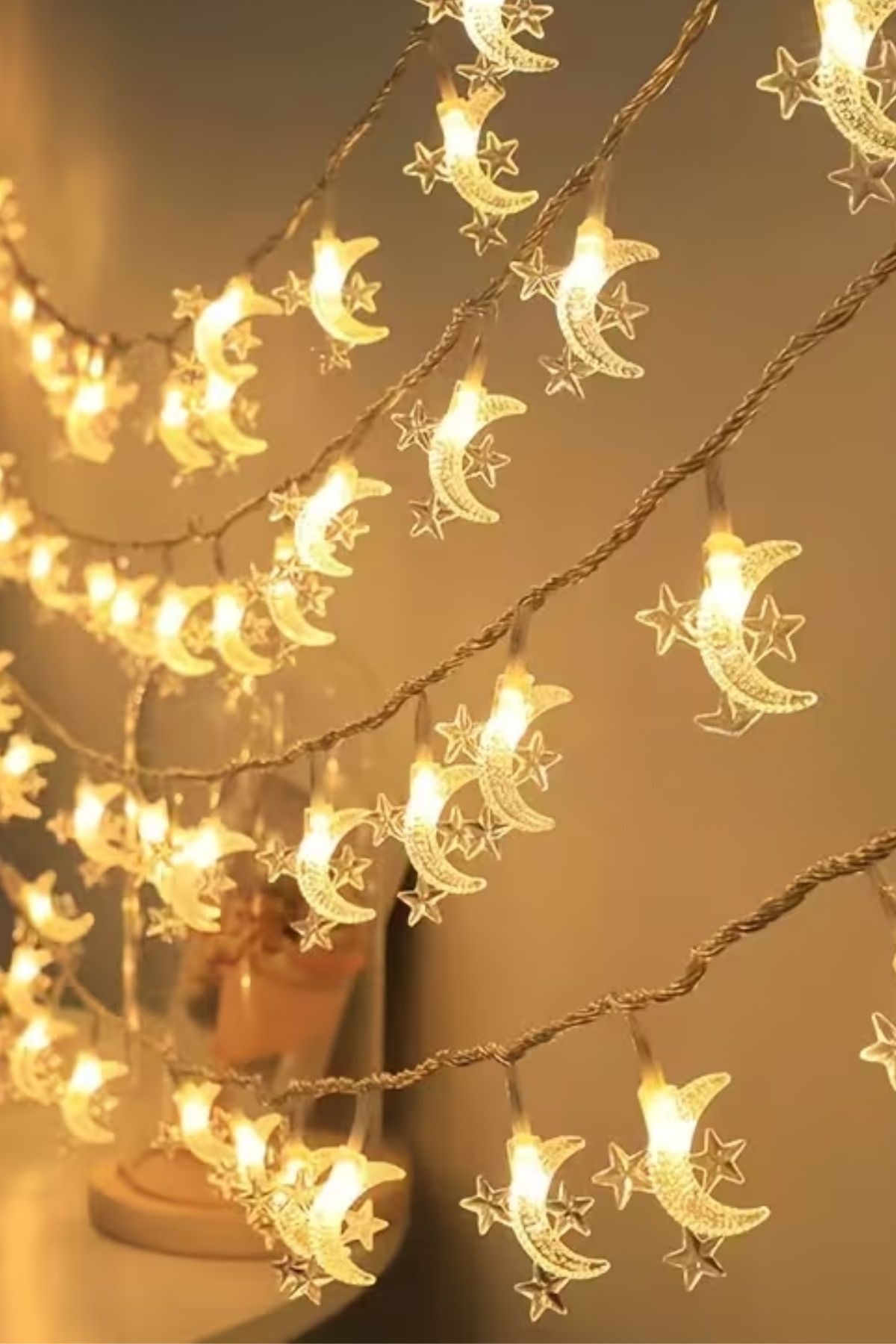 Hilal figürü ve onu tamamlayan 3 mini yıldız detayları, Ramazan ruhunu yansıtan zarif bir görünüm oluşturur. İftar sofralarından salon dekorasyonuna kadar her ortamda sıcak ve huzurlu bir ambiyans sağlar.