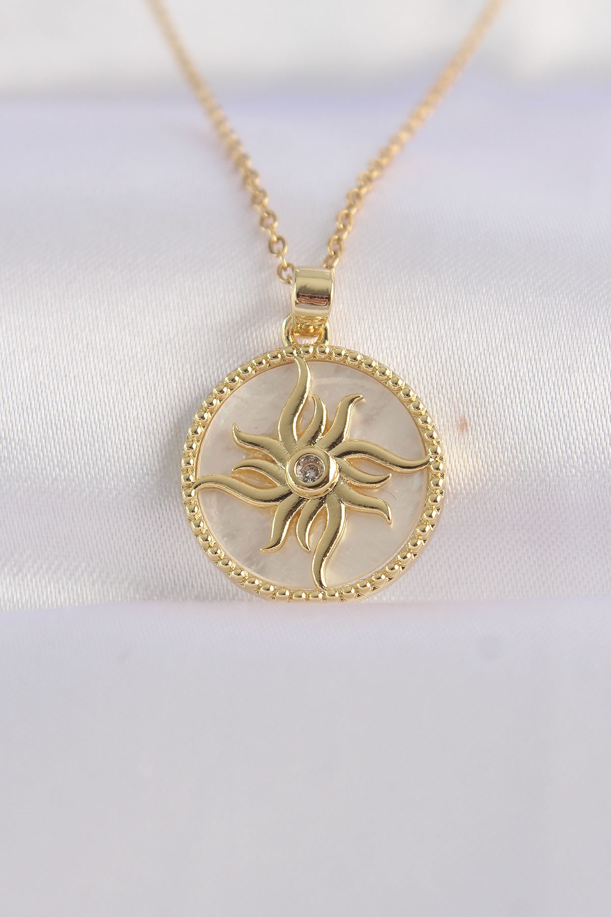 316L Çelik Zincir Altın Renk Zirkon Taşlı Oval Tasarım Güneş Kolye