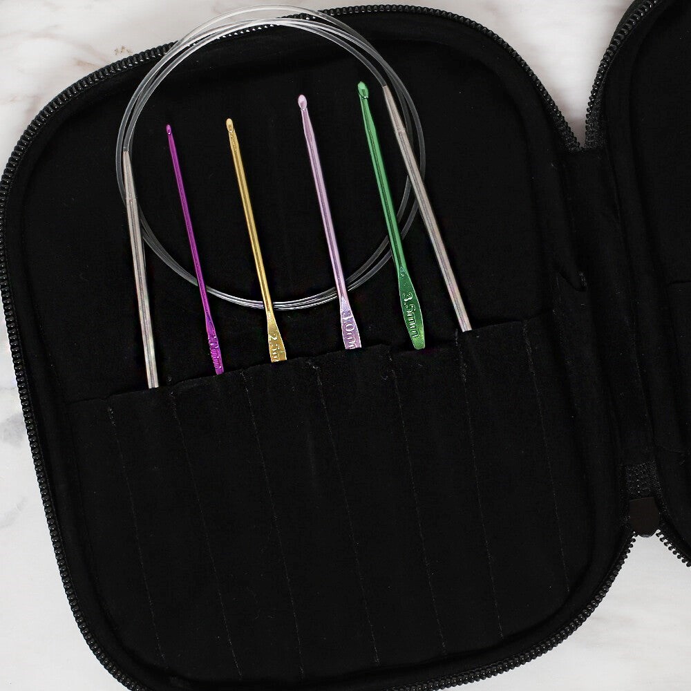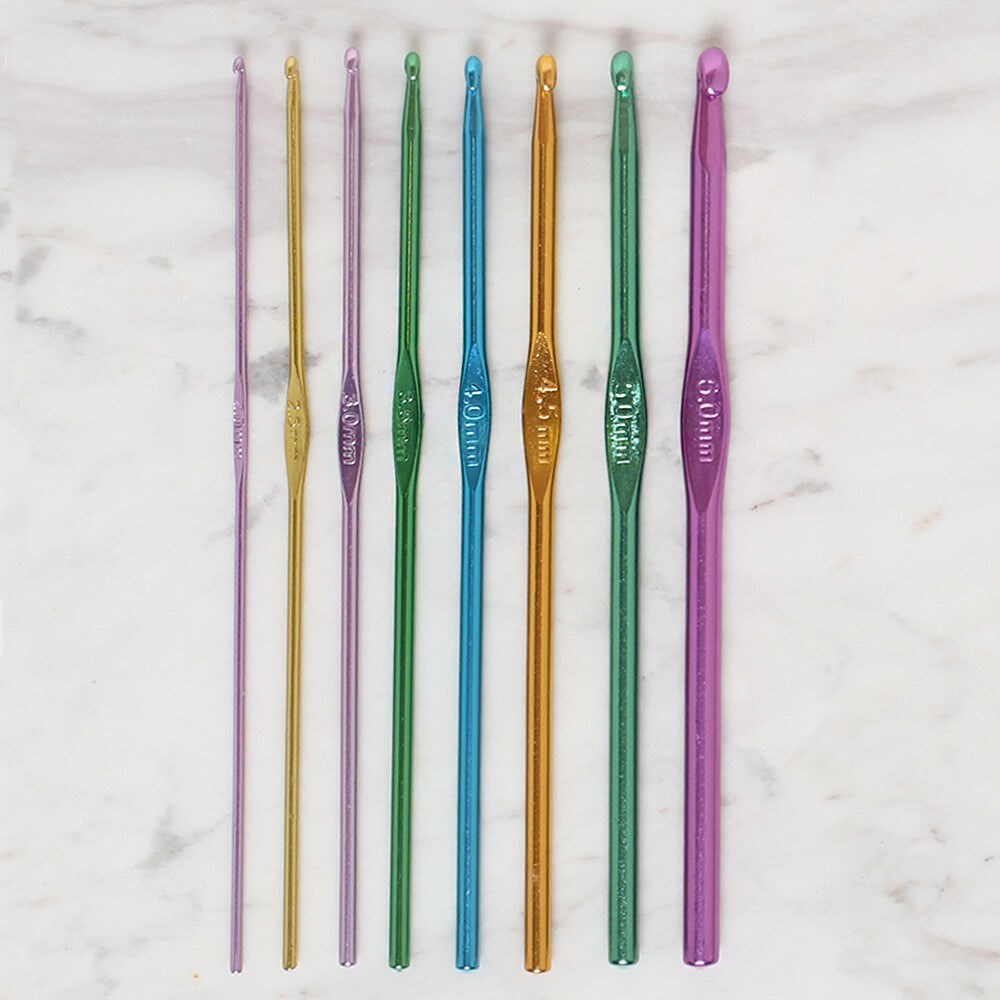 - Renkli Metal Yün Tığ numaraları; 2 mm, 2.5 mm, 3 mm, 3.5 mm, 4 mm, 4.5 mm, 5 mm, 6 mm,