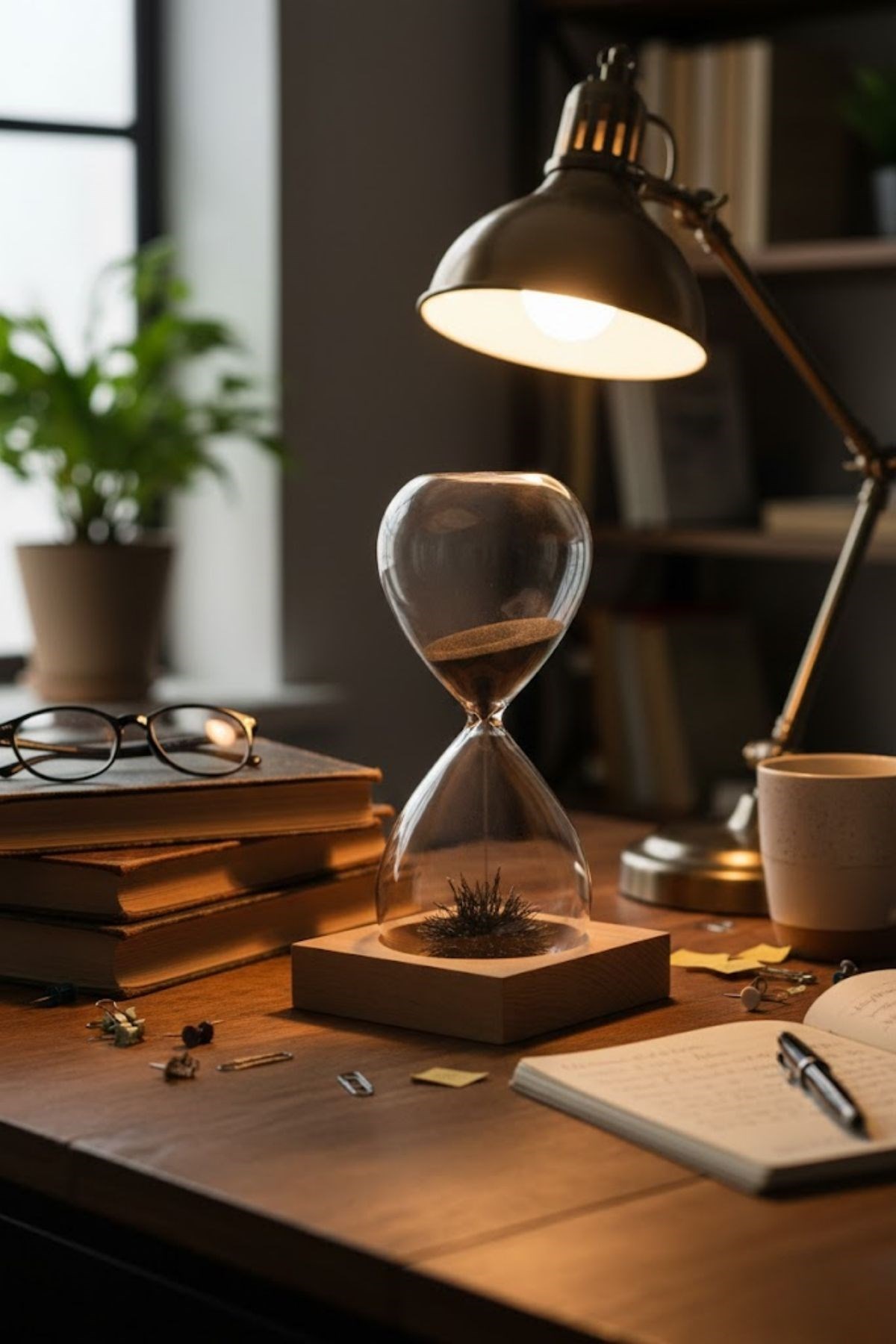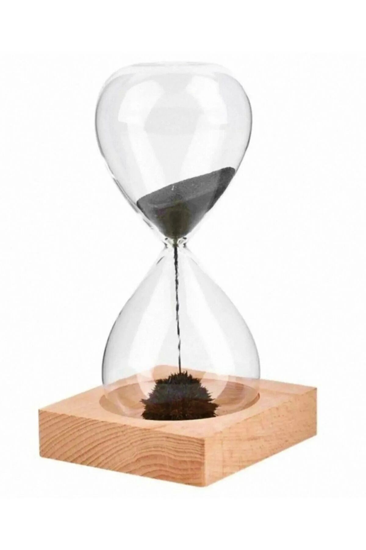 mıknatıslı cam kum saati; ofis hediyesi, masaüstü aksesuarı ve dekoratif obje arayanlar için zarif ve dikkat çekici bir tercihtir.