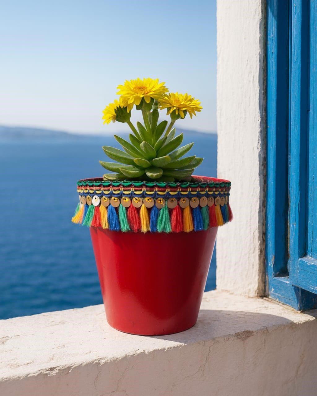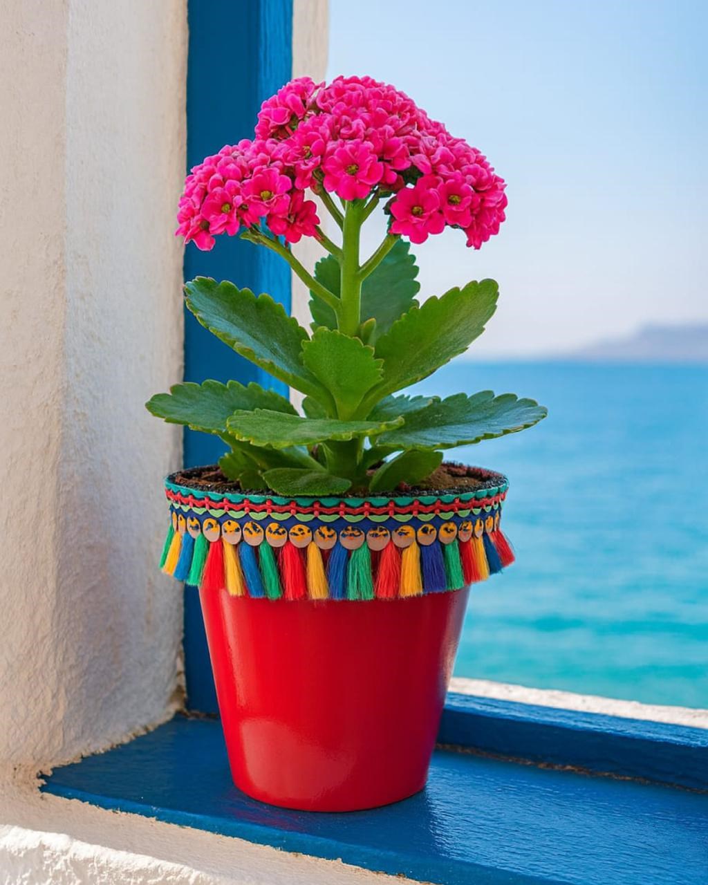🌸 Ege Esintili Dekoratif Saksı Deniz manzaralı Ege evlerinden ilham alan bu renkli saksı modeliyle yaşam alanına pozitif enerji ve canlılık kat!Kırmızı gövdesi, renkli püskül detayları ve zarif pembe çiçekli sukulentiyle hem iç hem dış mekanda dekoratif bir atmosfer oluşturur.; ✅ Yükseklik: 15 cm✅ Dayanıklı plastik malzeme✅ Hem pencere kenarlarında hem masa üstü dekorunda uyumlu🛍️ NF Trend Store mağazasında stoklara girmiştir.; 🌿 Enerjini yenile, yaşam alanını renklendir!✨ Şimdi keşfet, bitmeden sipariş ver!