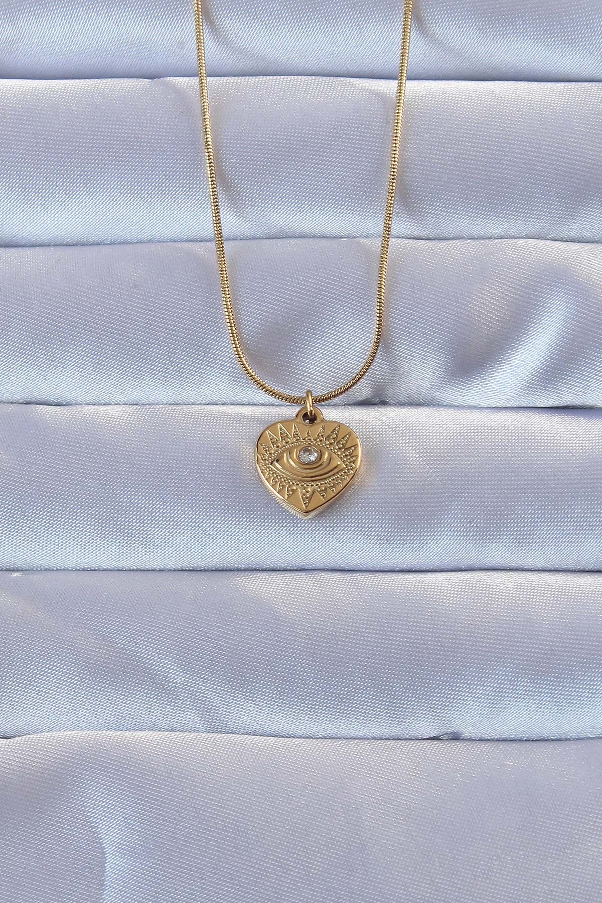 316L Altın Renk Zirkon Taşlı İşlemeli Göz Detay Kalp Kolye