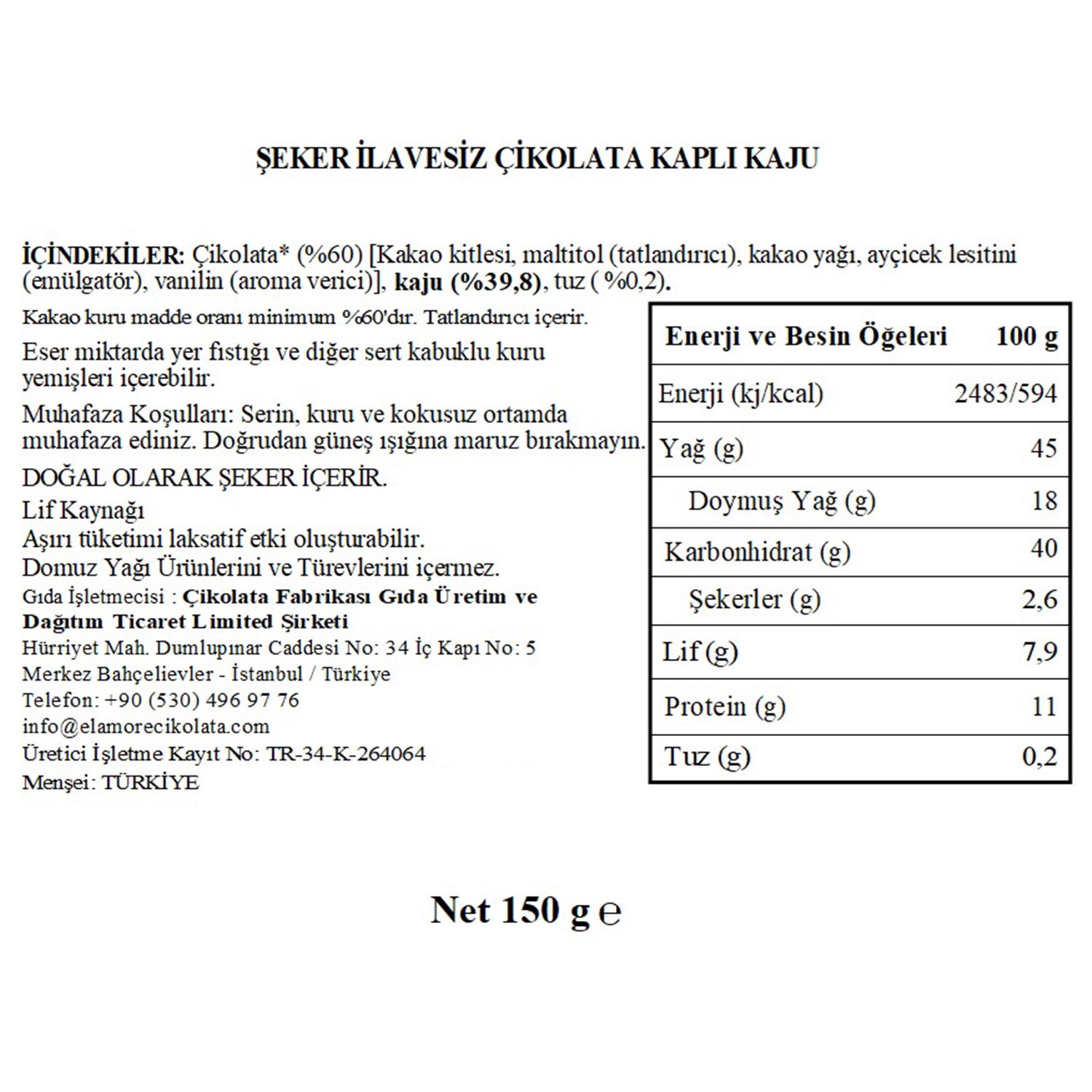 Elamore Çikolata, şeker ilavesiz, glütensiz, vegan formülüyle yoğun kakao lezzetini Belçika ustalarının tarifleriyle buluşturuyor. %60 kakao oranına sahip gerçek bitter çikolata ile kaplanan kaju tatlı ihtiyacınızı benzersiz bir deneyime dönüştürüyor.